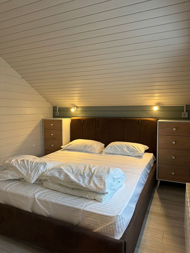 В распоряжении гостей полностью оборудованная кухня, гостиная зона с большим диваном, 4 спальные комнаты, туалетные комнаты, мангал, качели, песочница.