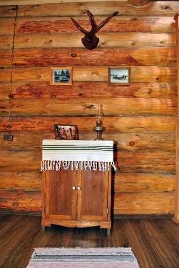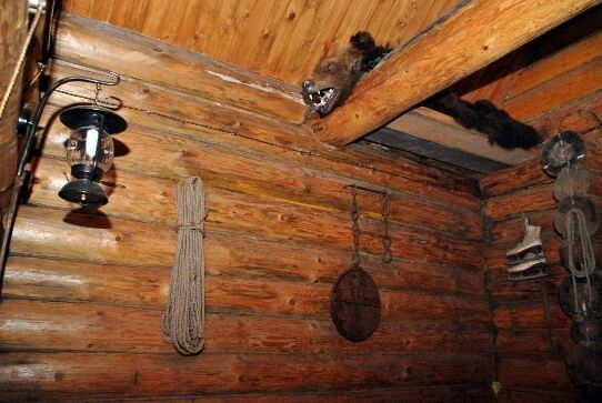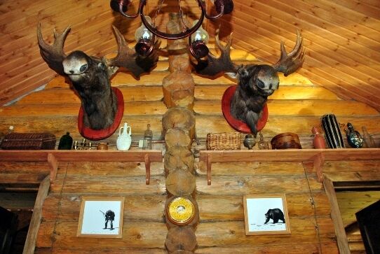Интерьер дома оформлен в охотничьем стиле с чучелами животных, предметами антиквариата, мебелью ручной работы.