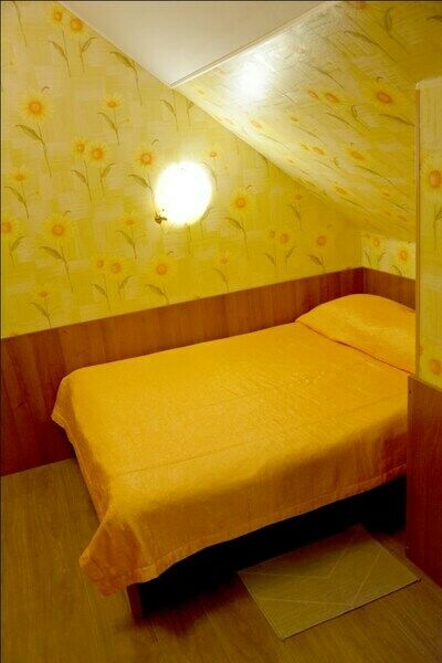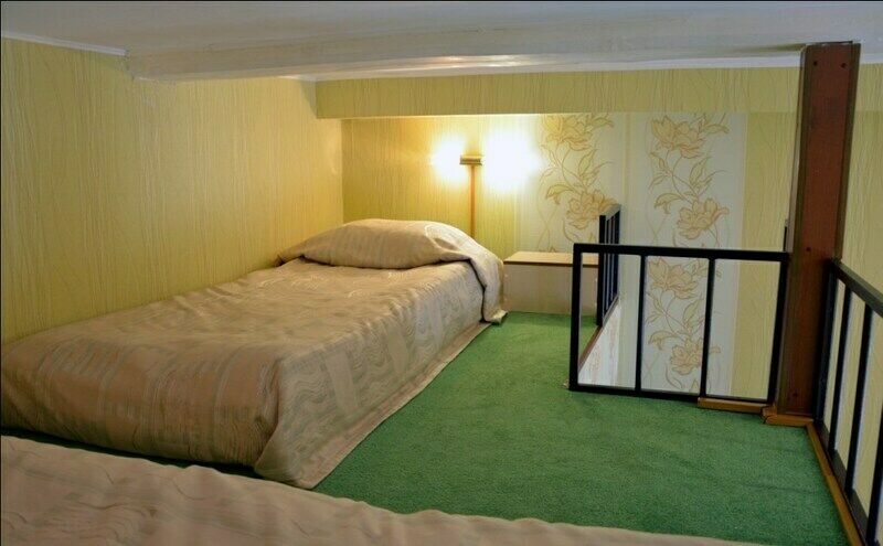 Стандартный четырехместный номер эконом-класса Оригинальная планировка этого номера делает его привлекательным для семейного размещения либо для компании, предпочитающей бюджетный вариант отдыха Пространство номера разделено на 2 зоны – верхнюю и нижнюю. В нижней зоне - 2 односпальных кровати, телевизор, мебель для отдыха и размещения вещей. Наверх ведет удобная металлическая лестница с перилами. Зона отдыха (антресоли/полуэтаж) имеет 2 спальных места на широком ковровом подиуме с отдельными светильниками Санузел в номере является неполным. Бесплатное пользование комфортными душевыми кабинами в шаговой доступности от номера В номере 2 односпальных кровати 2 спальных места в верхней зоне отдыха шкаф и тумбы для одежды стол стулья ТВ wi-fi В ванной комнате неполный санузел раковина унитаз жидкое мыло 4 полотенца стаканы
