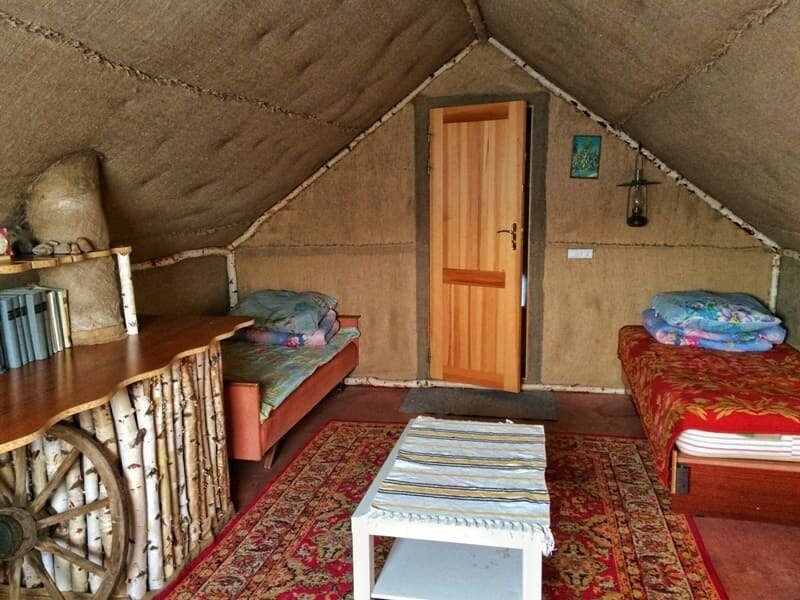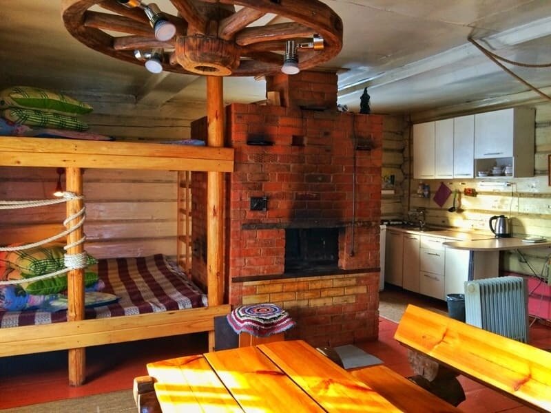 Уютный деревянный двухэтажный дом-изба, рассчитанный на одновременное проживание 12 человек. одна комната, все кровати 2 ярусные. В доме есть все удобства (душ, туалет). А наличие русской печки и большого деревянного стола, позволяет устроить задушевные посиделки в компании. Также в доме имеется телевизор,холодильник, СВЧ, кухонная утварь.