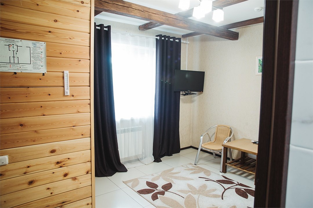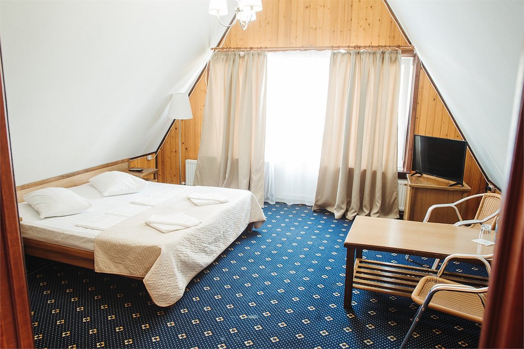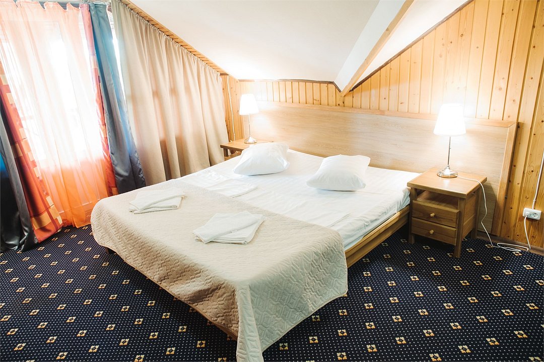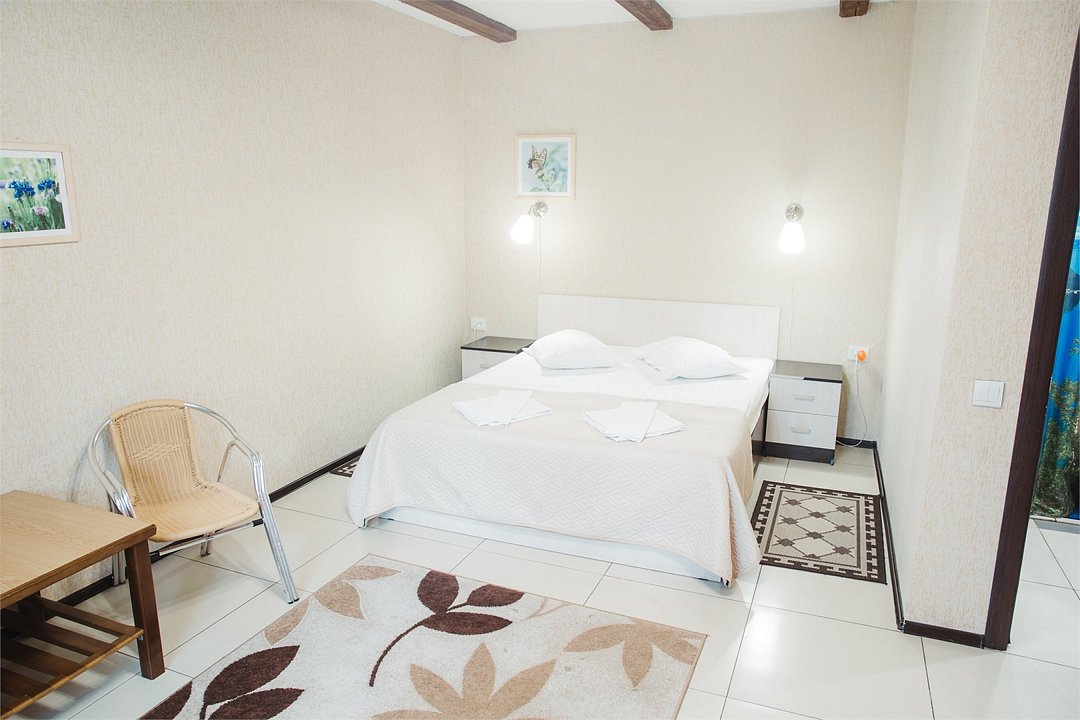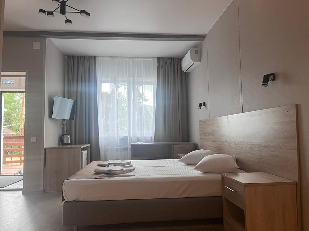 Однокомнатный двухместный номер с одной двухспальной кроватью. Площадь номера — 26 кв.м. В номере: прихожая, спальная комната, ванная комната с душевой кабиной, диван. Оснащение номера: фен, туалетные принадлежности, спутниковое TV, холодильник, ср-ва личной гигиены (гель/шампунь), посуда на 2 персоны (приборы/порционные тарелки, чайная пара, стаканы), двуспальная кровать, диван, кондиционер, халаты, тапочки одноразовые, бесплатный Wi-Fi в общественных местах. По запросу в номере устраивается на диване дополнительное место для одного взрослого или два детских места.Услуги и удобства