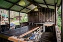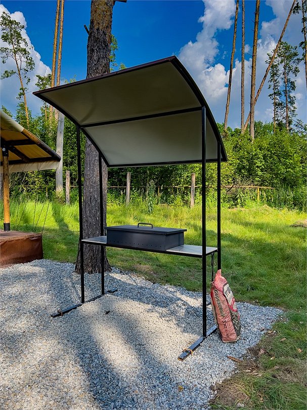 Однокомнатная двухместная глэмпинг с одной двуспальной кроватью и мангальной зоной + можем установить дополнительное спальное место (диван). Площадь глэмпинга — 28 кв. м. Оснащение: двуспальная кровать, диван, стол, 2 табуретки, электричество и осветительные приборы, рейл для одежды, а также большая лоджия включающая в себя 2 столика, 2 кресла, 2 стула. Удобства: кондиционер, вентилятор, мини-холодильник, полотенца, халаты, фен, эл. чайник, посуда на 2 персоны, бесплатный Wi-Fi. Туалет и душевая комната находятся сзади глэмпингов. Оснащение: фен, душевая кабина, зеркало, раковина. По запросу устанавливаем детскую кроватку.Услуги и удобства