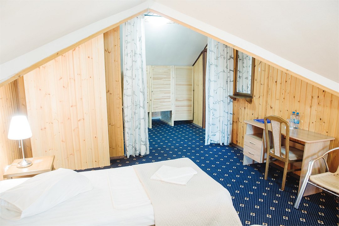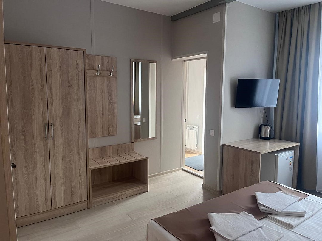 Однокомнатный двухместный номер с двумя раздельными кроватями/одной двуспальной кроватью. Площадь номера — 20 кв.м. В номере: прихожая, спальная комната, ванная комната с душевой кабиной. Во всех номерах данной категории имеются большие лоджии . Оснащение номера: фен, холодильник, туалетные принадлежности, спутниковое ТV, ср-ва личной гигиены (гель/шампунь), эл.чайник чайные чашки на 2 персоны, стаканы, холодильник, бесплатный Wi-Fi в общественных местах.Услуги и удобства