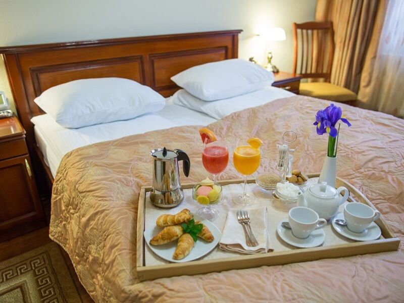 На ресепшене нас приветливо встретила администратор. Номер на третьем этаже. Вид из окон шикарен. Сам номер чист и уютен. Есть тапочки, халаты, много полотенец и мыльных принадлежностей. В номере большая кровать, прикроватные тумбочки с мягким освещением. Имеется маленький холодильник. Чистый , без запахов (!)