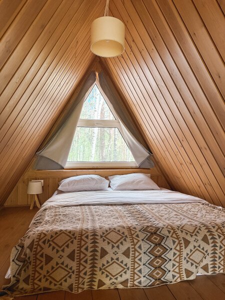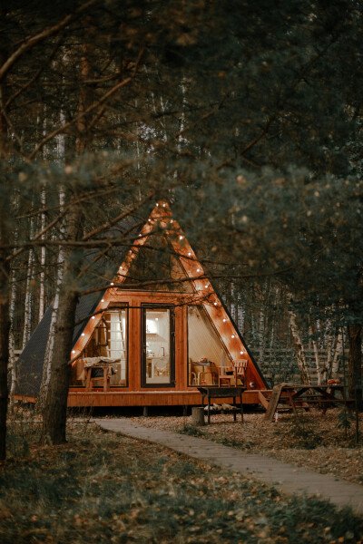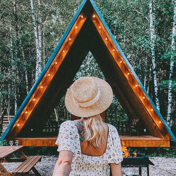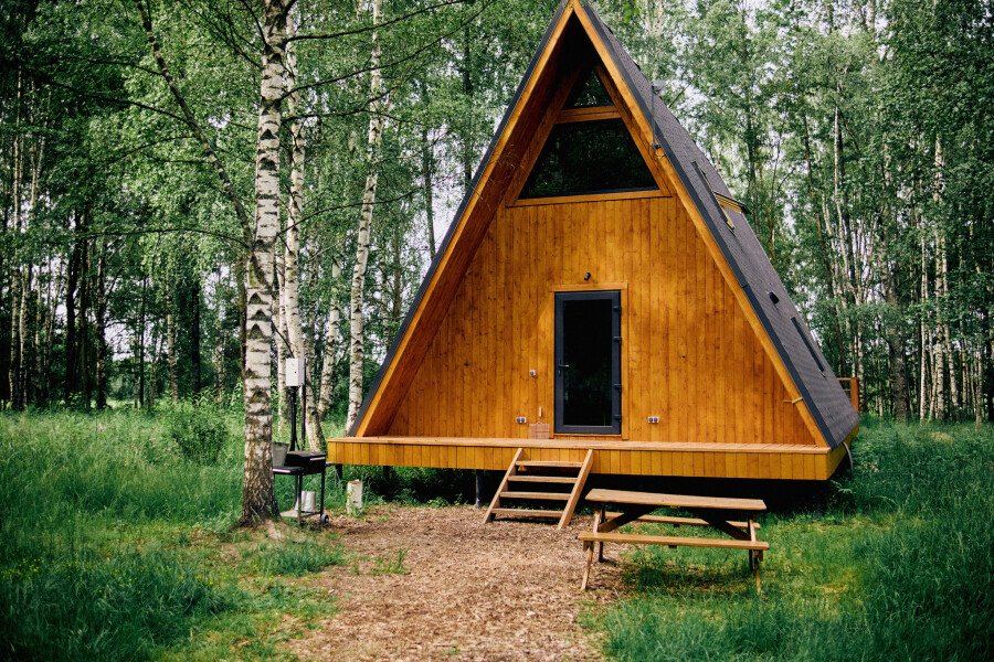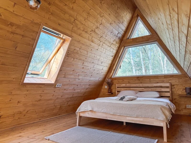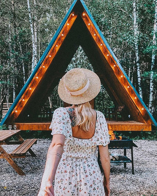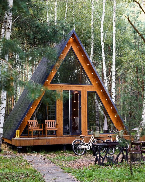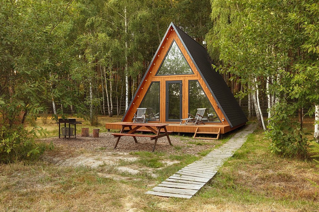 Треугольные строения напоминают шалаш, в котором на небольшой площади есть всё что нужно для отдыха. Они оснащены панорамным фасадом, а на втором уровне располагается кровать с отдельным окном с видом на лес. Возле каждого строения имеется гамак и площадка с мангалом для барбекю.
