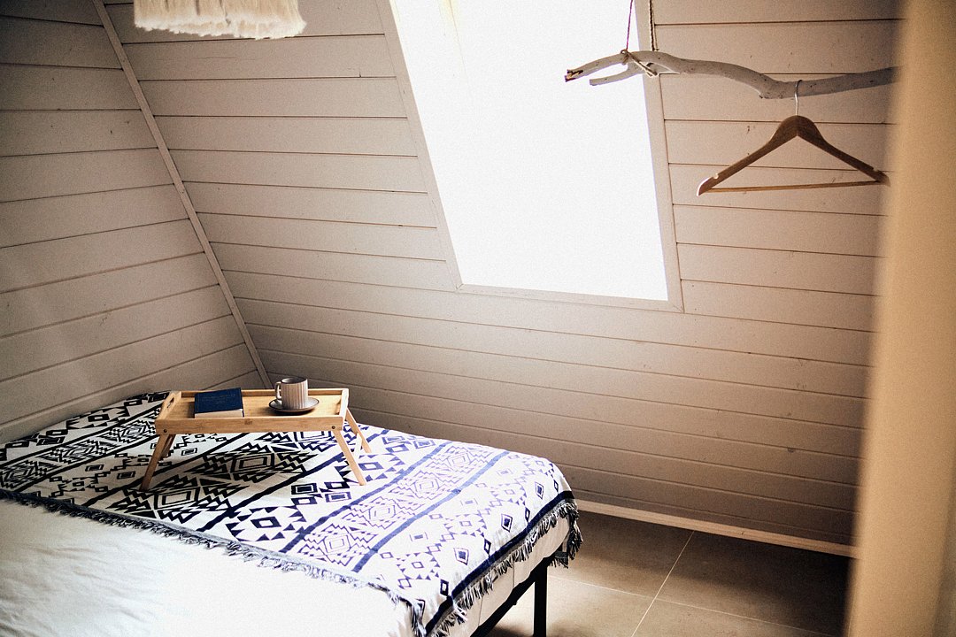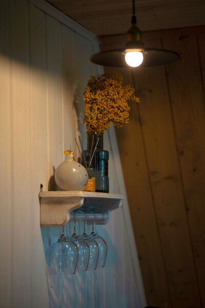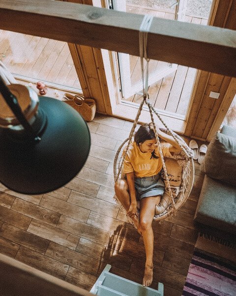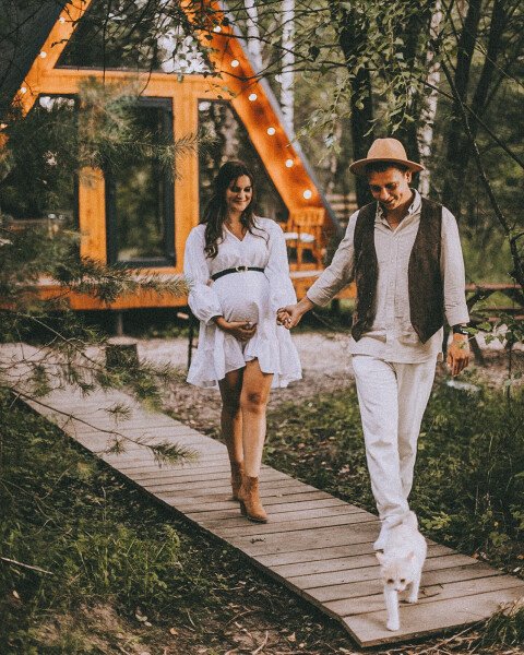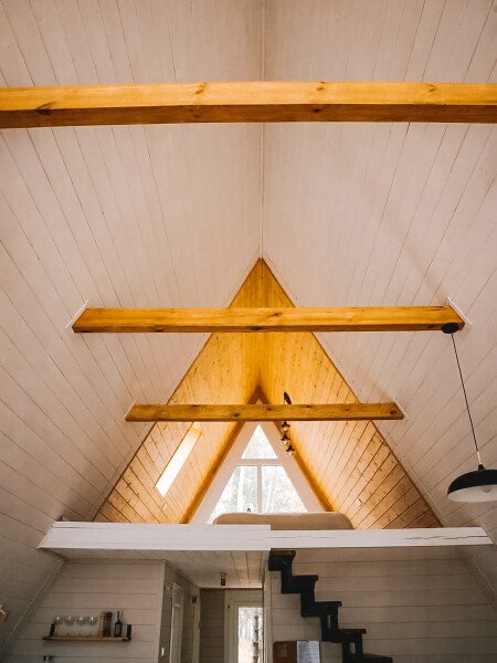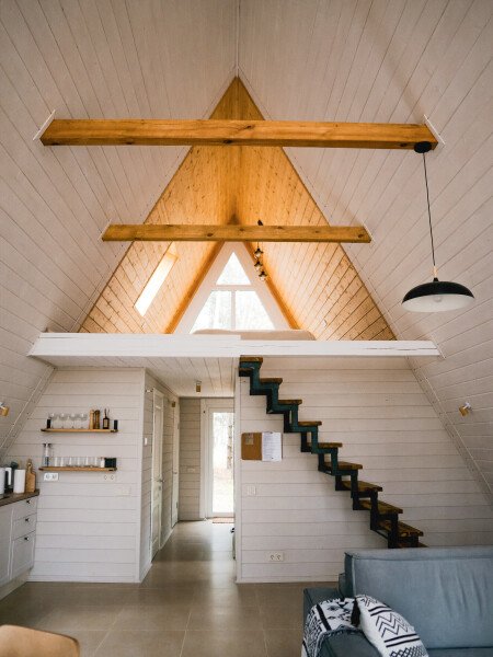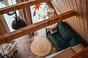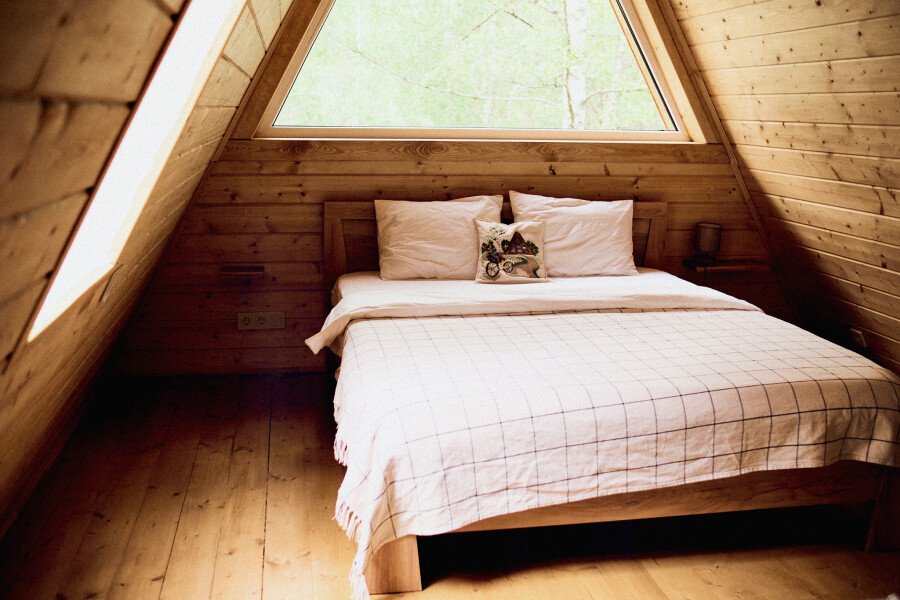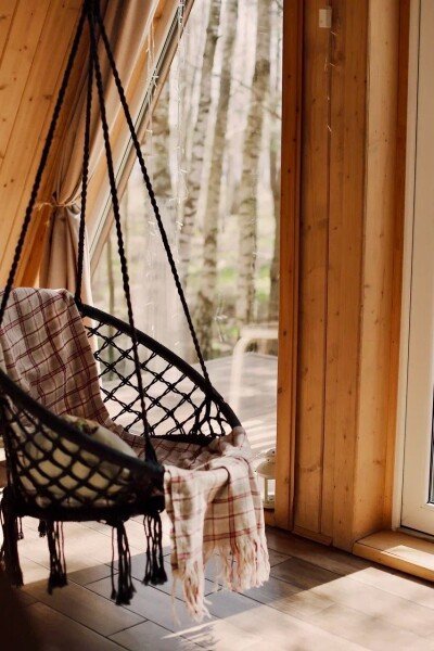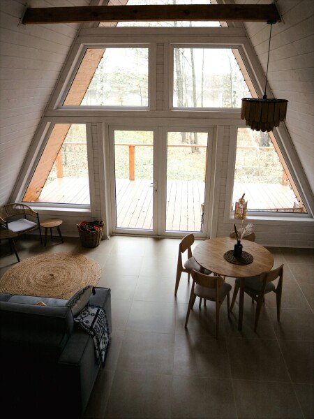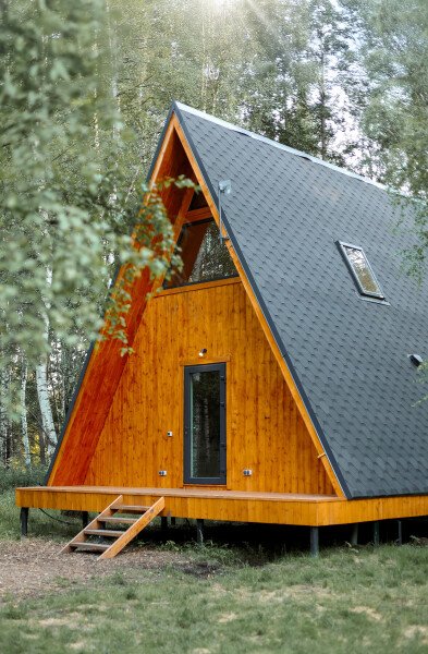 Треугольные строения напоминают шалаш, в котором на небольшой площади есть всё что нужно для отдыха. Они оснащены панорамным фасадом, а на втором уровне располагается кровать с отдельным окном с видом на лес. Возле каждого строения имеется гамак и площадка с мангалом для барбекю.