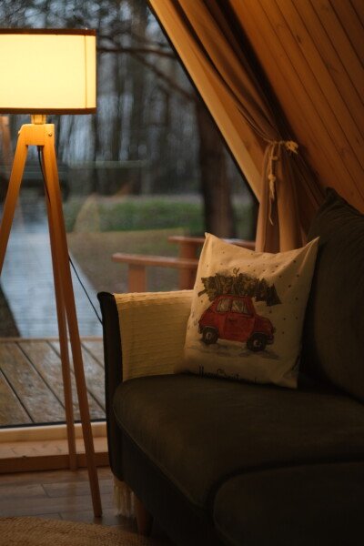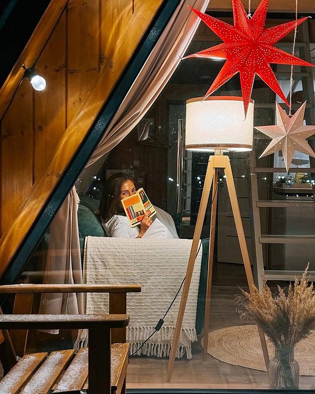 На террасе каждого домика есть диван с креслами и стол. Также на территории есть кафе, чтобы вы могли полноценно отдохнуть и не стоять у плиты).