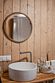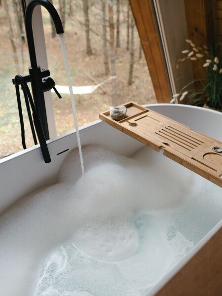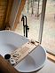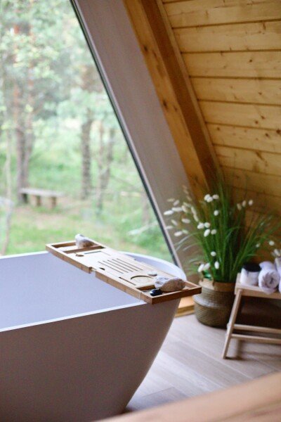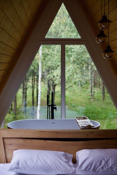 Уникальный треугольный дом с отдельно стоящей ванной у панорамного окна с видом на хвойный лес.