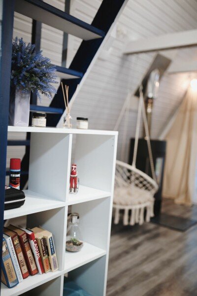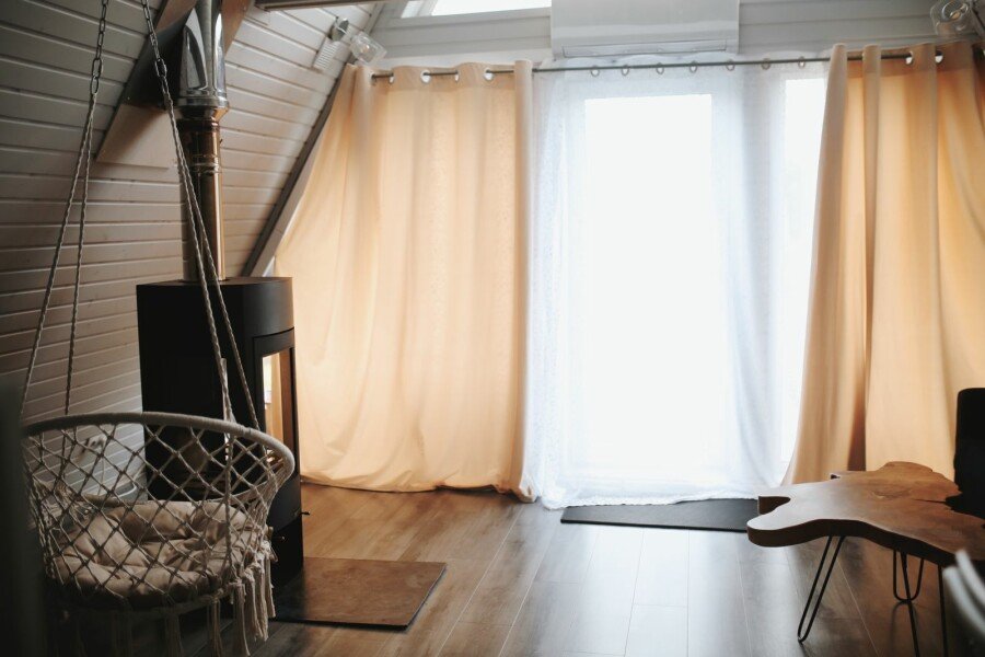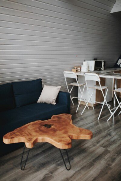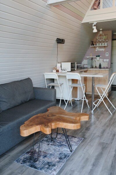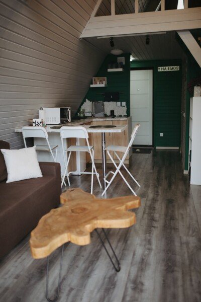В гостиной располагается камин, диван, журнальный столик, два стула, кресло-качели. Для того чтобы насладиться природой, не установили в домиках телевизоры, но отлично работает Wi-Fi. Кондиционер, который расположен в гостиной, работает как на охлаждение, так и на обогрев. Алиса умеет включать и выключать теплый пол, установлены обогреватели.