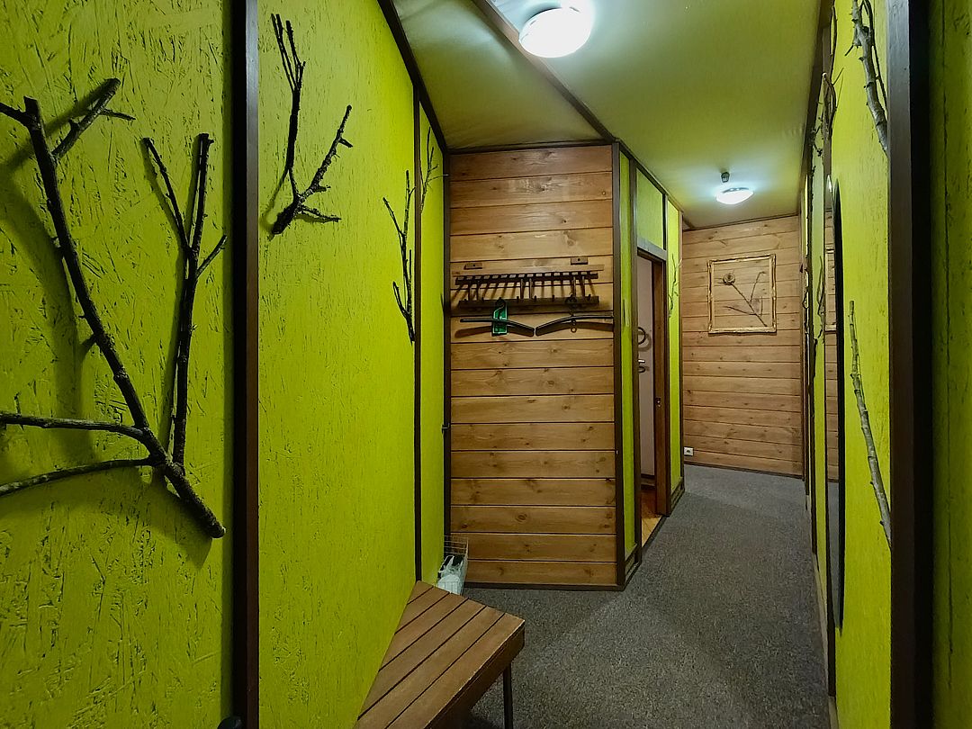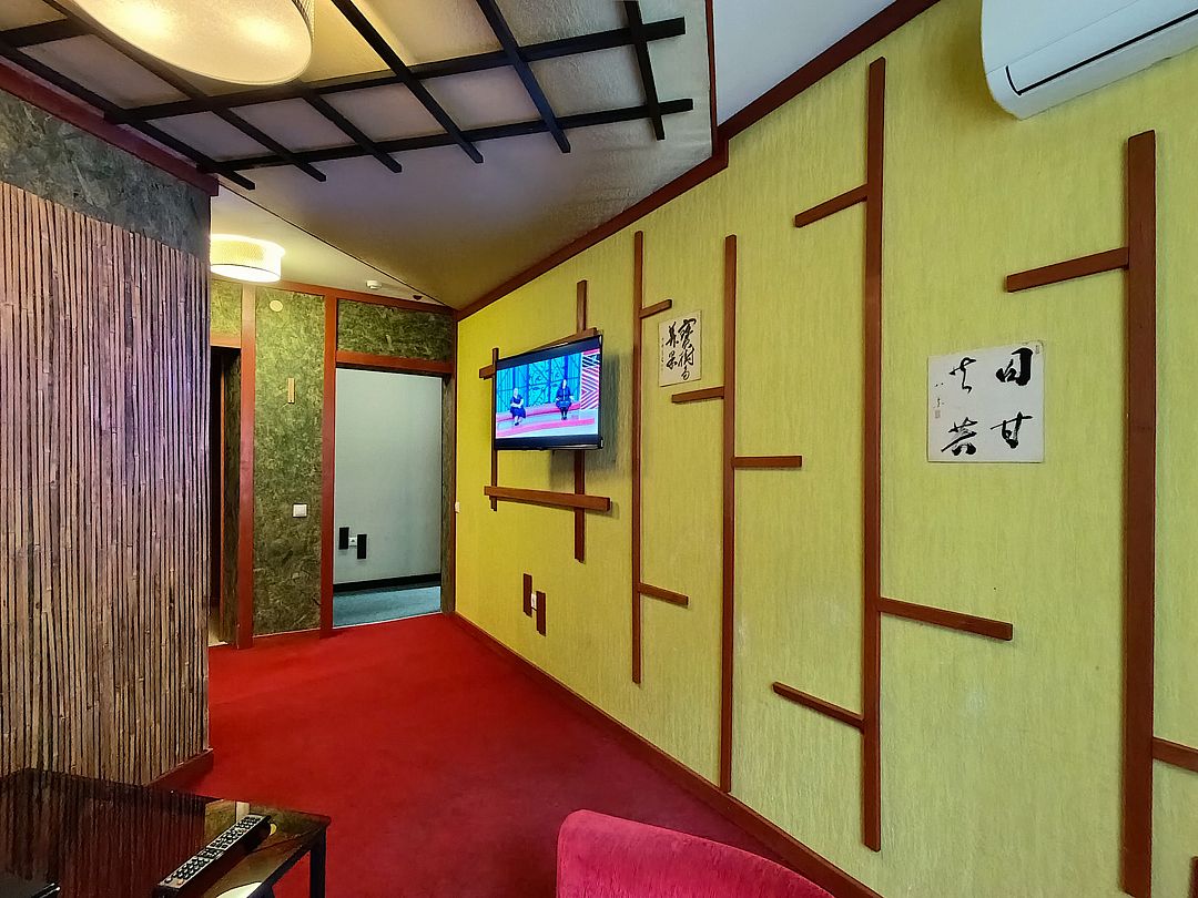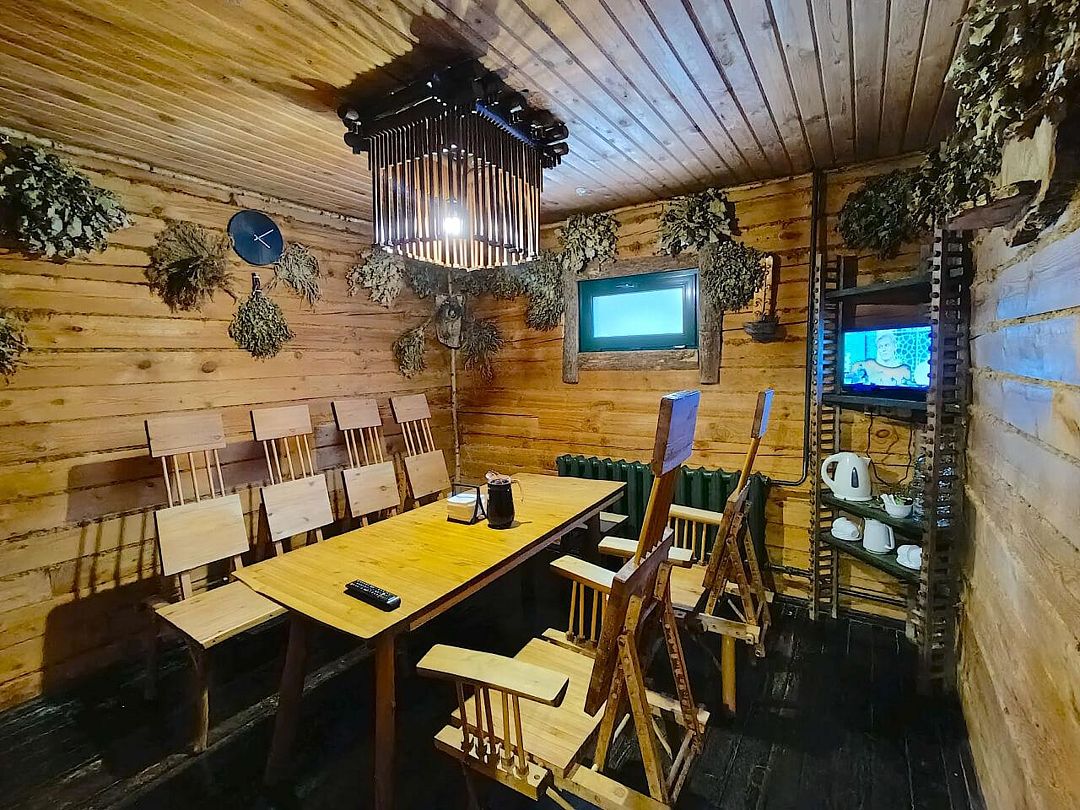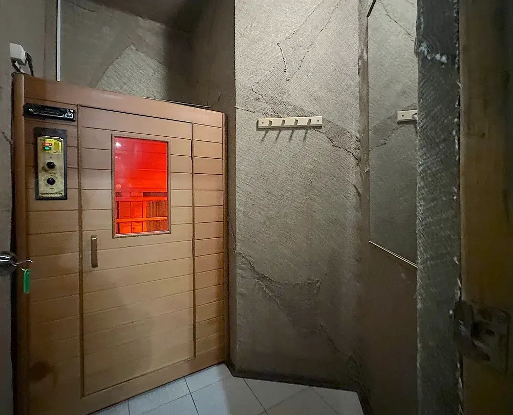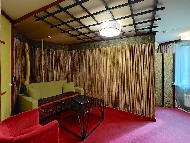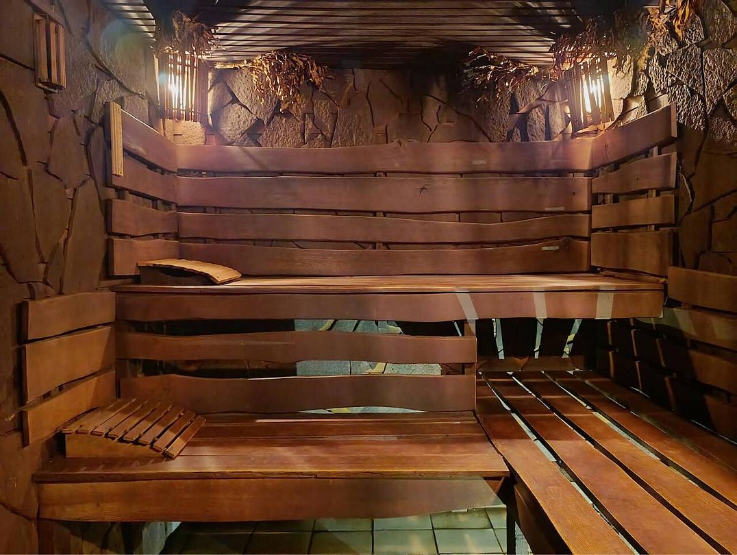Инфраструктура: тапочки, бассейн, полотенца, простыни, шапочкиК услугам гостей финская сауна уникального дизайна с бассейном и ледяным контрастным душем. Полоки в парилке изготовлены из африканского дерева абаш, а стены из лиственницы, облицованной специальным красным камнем — плитняком.