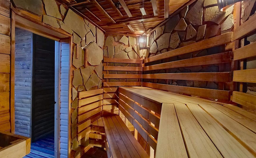 Читать полностьюК услугам гостей финская сауна уникального дизайна с бассейном и ледяным контрастным душем. Полоки в парилке изготовлены из африканского дерева абаш, а стены из лиственницы, облицованной специальным красным камнем — плитняком.