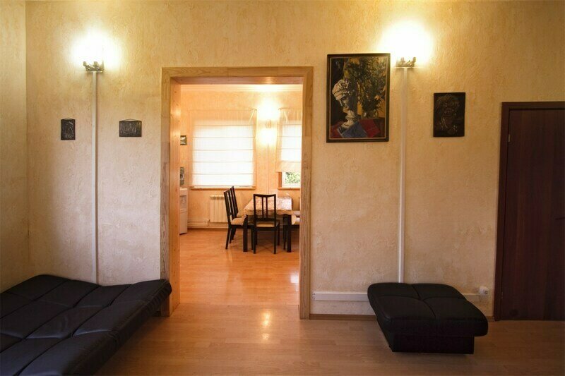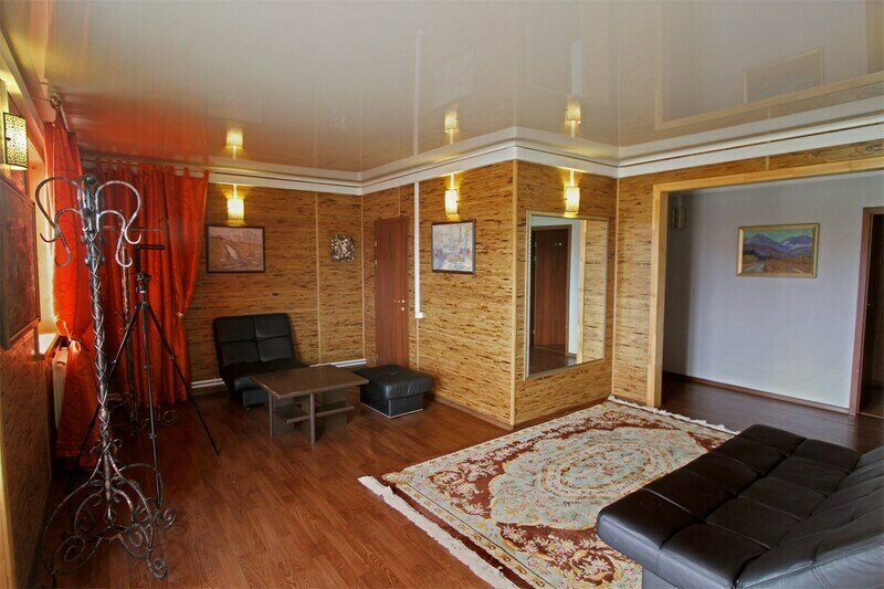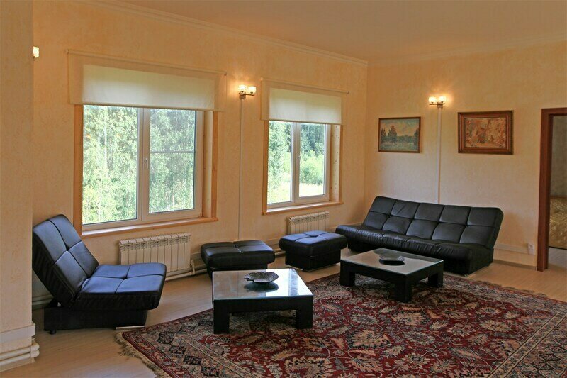 - Зал на 1-м этаже 75 м2 — изысканная атмосфера советской классики 20 века переплелась с современным стилем архитектуры — на стенах висят картины художников реалистов, в зале большие окна, ковры и современная мебель. Имеется выход на веранду.
