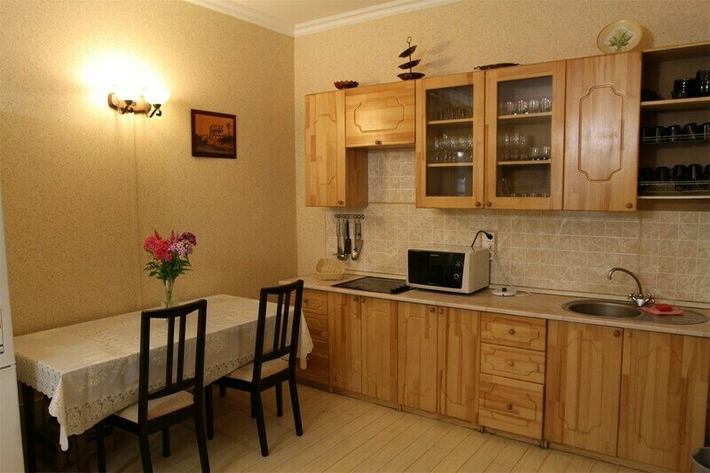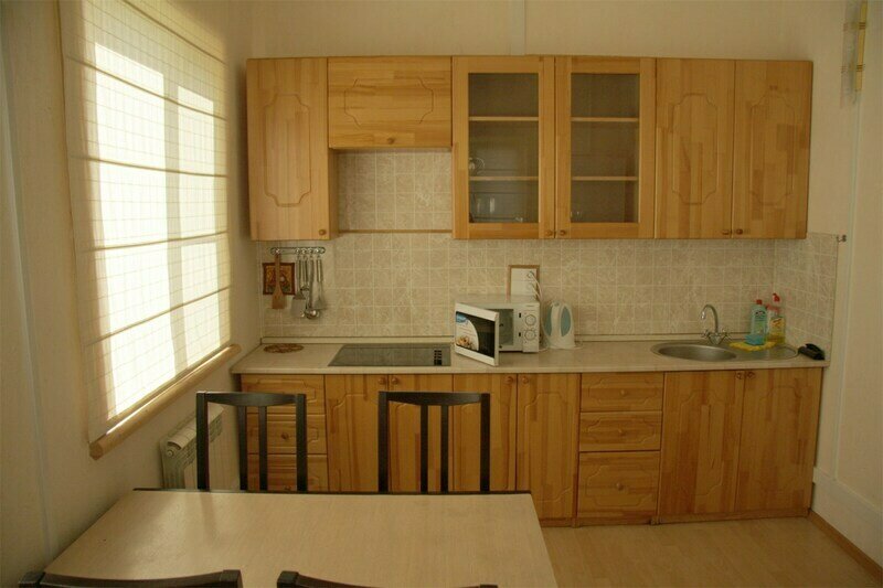 - Кухня с электроплитой, холодильником, СВЧ, кулером и посудой