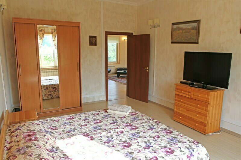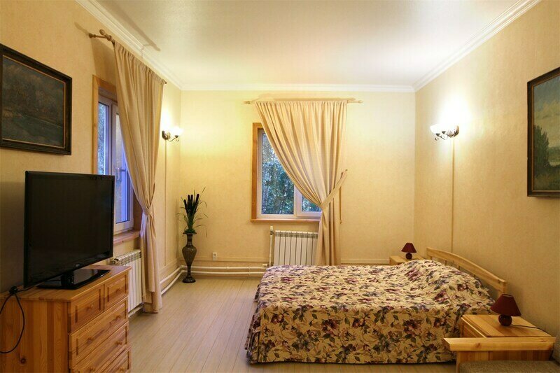- 4 люкс-номера: две комнаты, двуспальная кровать, мягкая мебель, шкаф, стол, телевизор, санузел с джакузи и балкон с видом на комплекс, лес и пруд с фонтаном