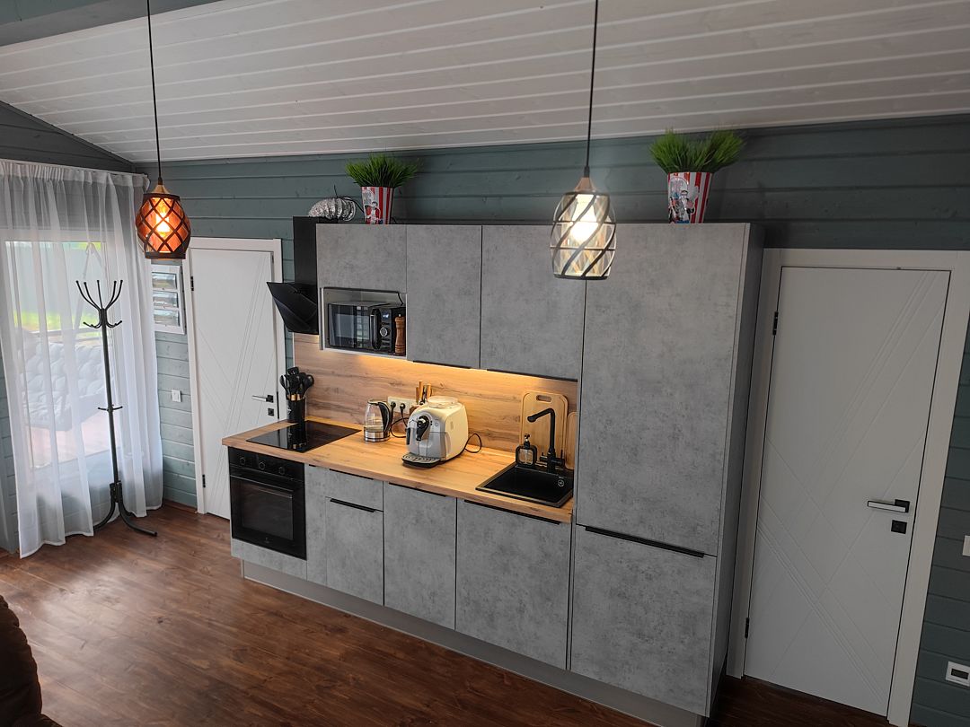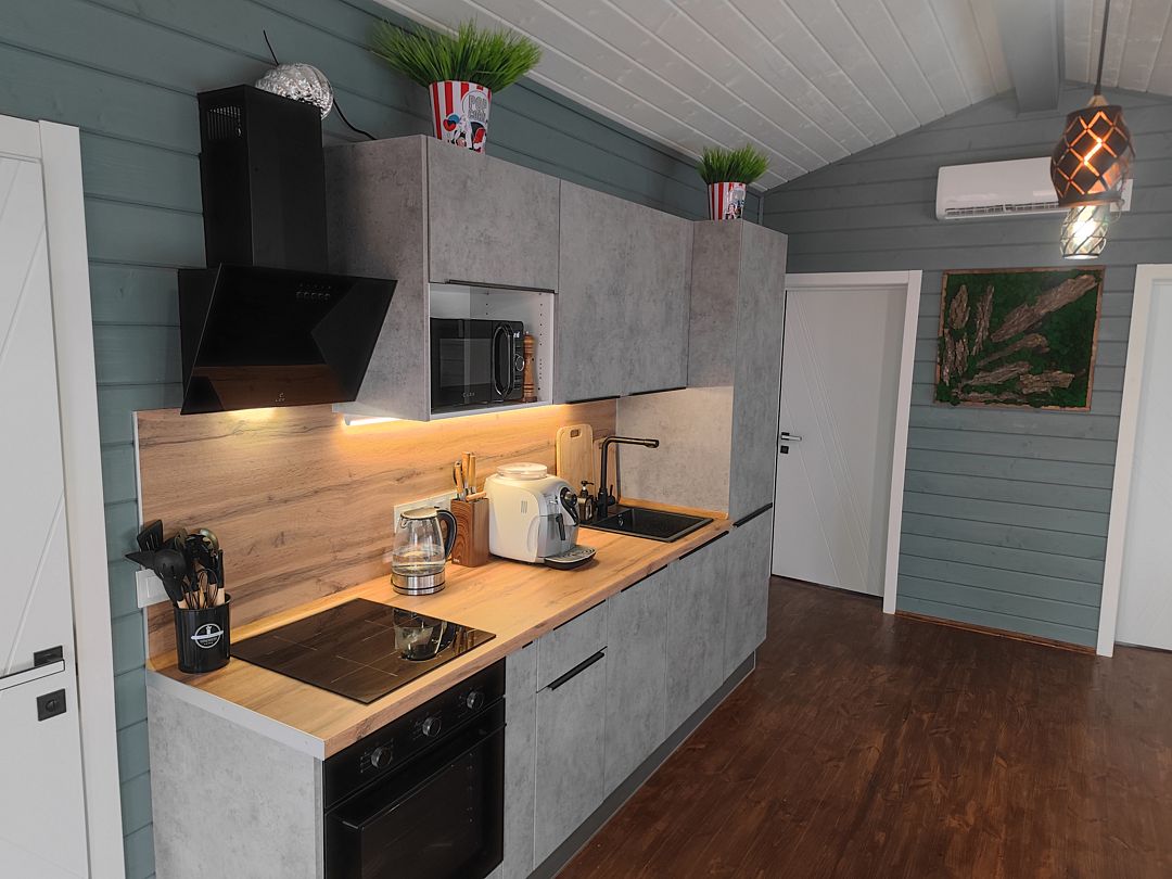 Техника: кондиционер, холодильник, плита, духовой шкаф, кофемашина, микроволновка, стиральная машина, посудомоечная машина, водонагреватель, телевизор, фен.