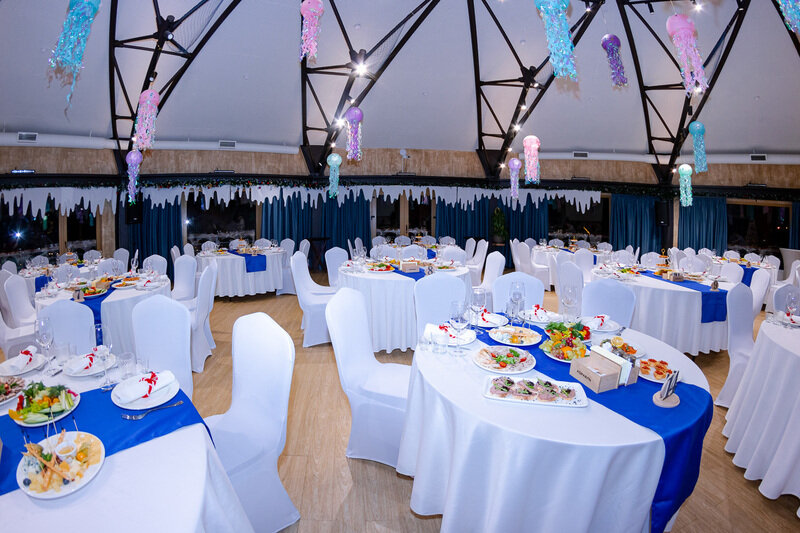 Питание, официальные мероприятия и банкет можно провести в ресторане на Восточной территории на 100 человек. На втором этаже ресторана находится конференц-зал вместимостью до 200 человек.