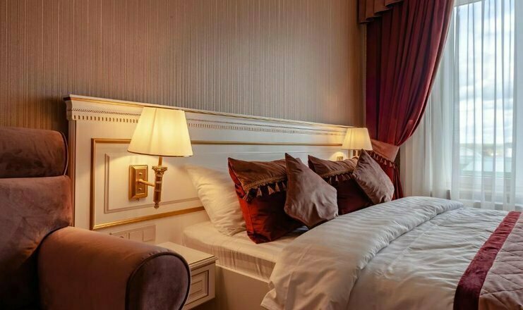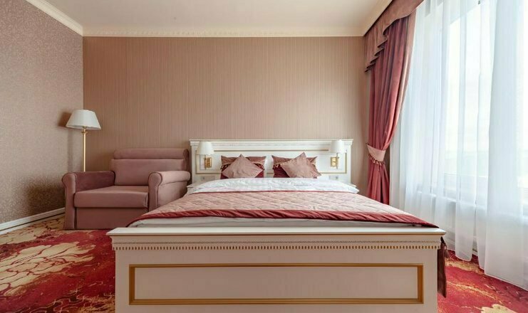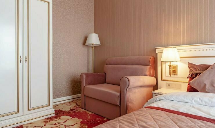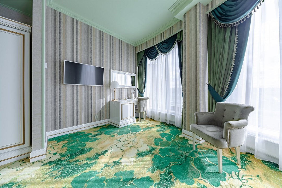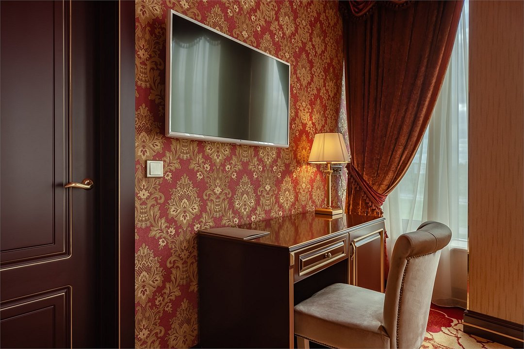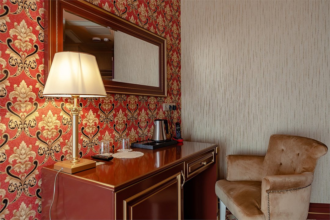 Двухкомнатный номер (спальня и гостиная) Размер номера составляет 47 м². Интерьер номера имеет роскошную обстановку и отделку. Включены дополнительные удобства (тапочки, халаты, чайные и кофейные принадлежности и др.)Услуги и удобства