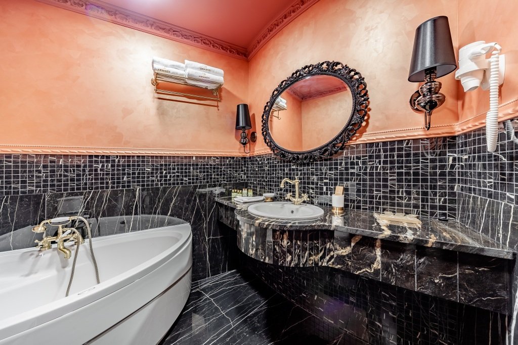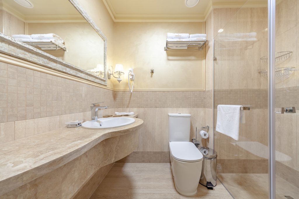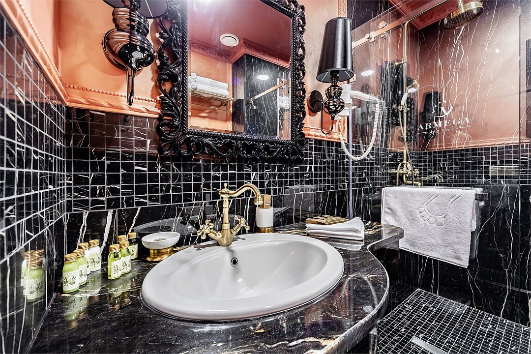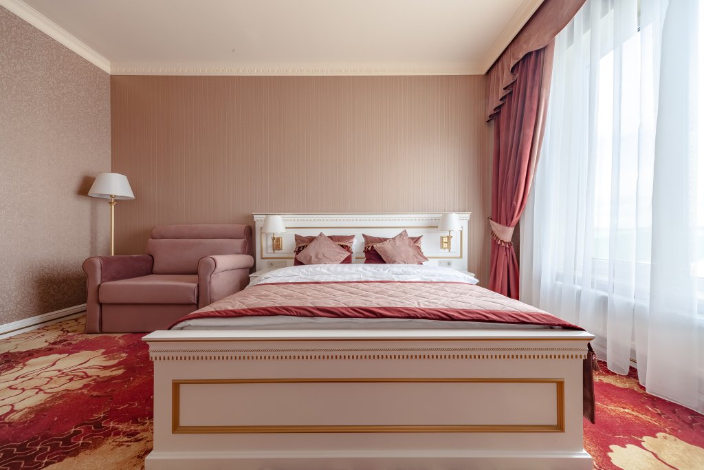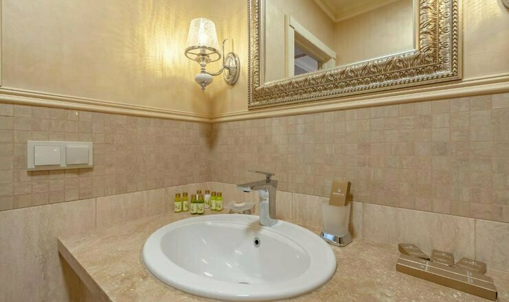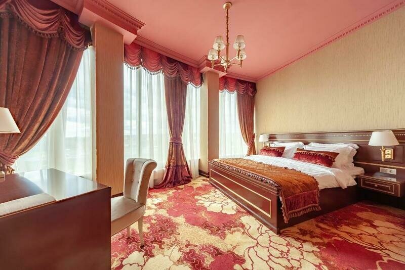 Двухкомнатный номер (спальня и гостиная) Размер номера составляет 47 м². Интерьер номера имеет роскошную обстановку и отделку. Включены дополнительные удобства (тапочки, халаты, чайные и кофейные принадлежности и др.)Услуги и удобства