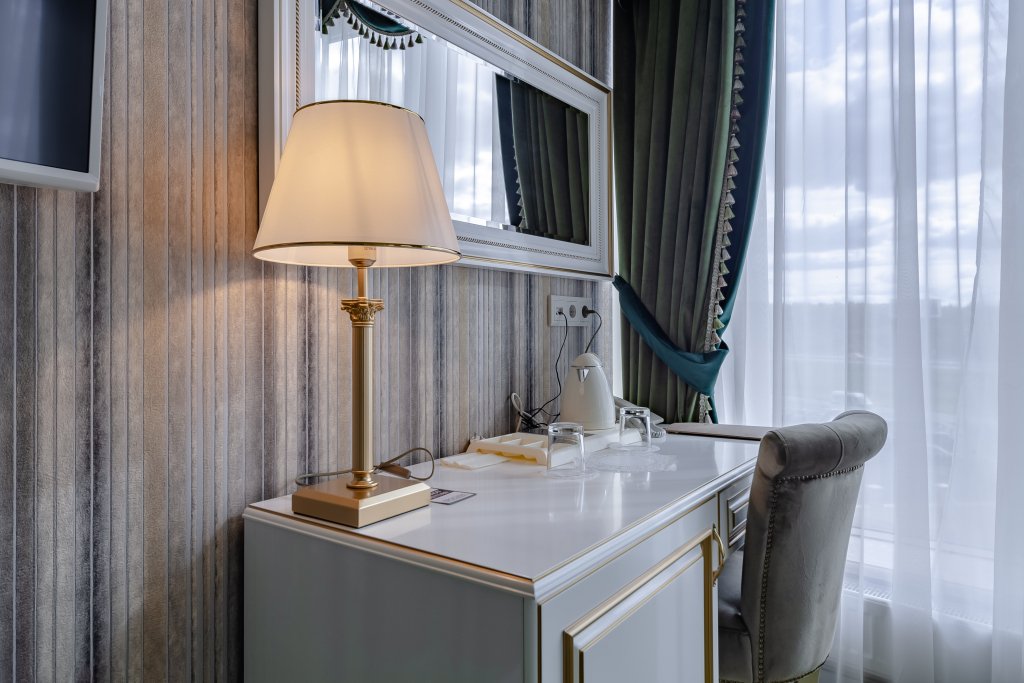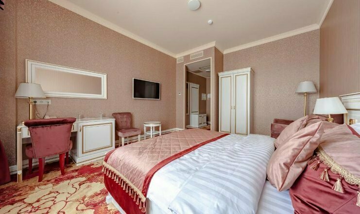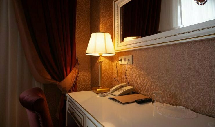 Wi-Fi, кондиционер, система климат-контроля, светильник, настольные лампы, фен, электронные замки, халаты, банные полотенца, тапочки, косметические средства, двуспальная кровать, тумбы, шкаф для одежды, вешалки, письменный стол, зеркало, звуконепроницаемые стены и окна, мини-бар, письменные принадлежности, информационная карта, меню, сейф, питьевая вода, ковровое покрытие, отопление, отдельный вход в номер, душ, вид на город, вид во двор, высокие потолки, стаканы, стул, стол, туалетные средства, туалет, цифровое тв, внутренний телефон, телевизор с плоским экраном, мини-холодильник, номер для некурящихВ номере