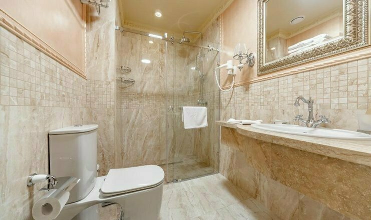 Самый роскошный двухкомнатный номер отеля площадью 47,5м² с выделенными зонами для работы, сна, отдыха, приема гостей . Интерьер номера элегантен: изящная мебель , светильники, элитные ткани.В санузле: гидромассажная ванна, умывальник, унитаз.Номер оборудован дополнительным туалетом,душем,и др. удобствами, создающими домашний уют.Услуги и удобства