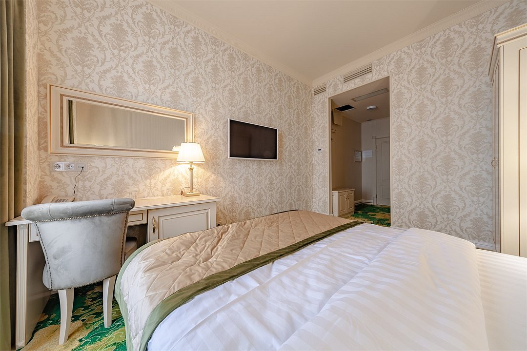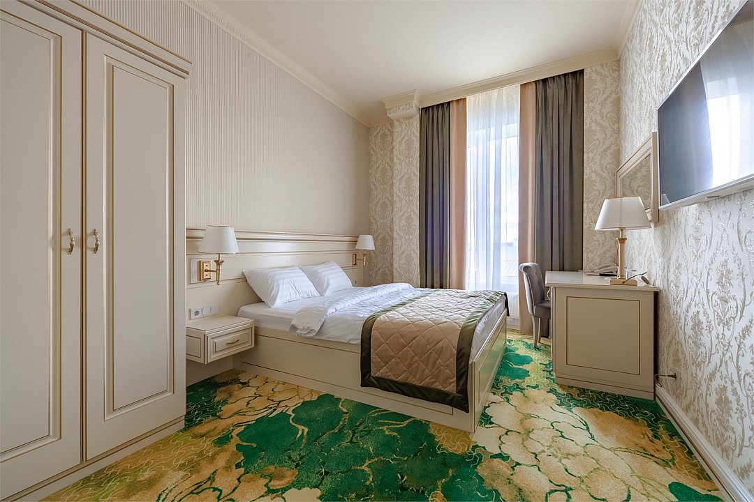 Однокомнатный номер с кроватью KING SIZE, расчитан на проживание одного или двух человек. При установке дополнительных кроватей в номере могут проживать большее количество человек.Включены дополнительные удобства (тапочки, халаты, чайные и кофейные принадлежности и др.) Размер комнаты составляет: 23-31м². В санузле: душ, умывальник, унитаз,туалетные принадлежности.Услуги и удобства