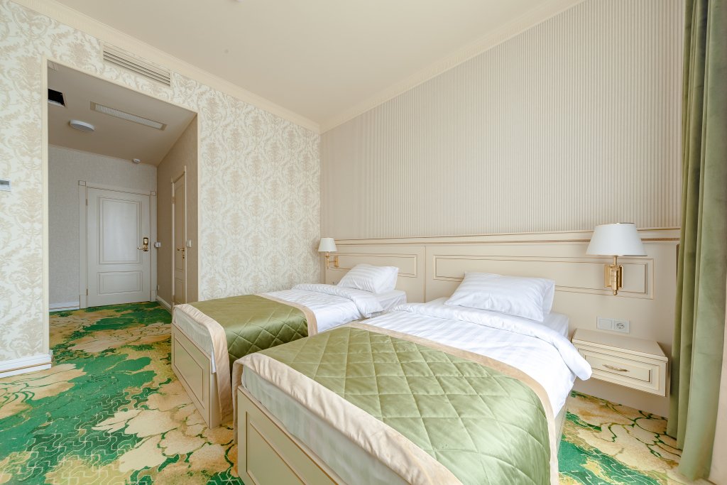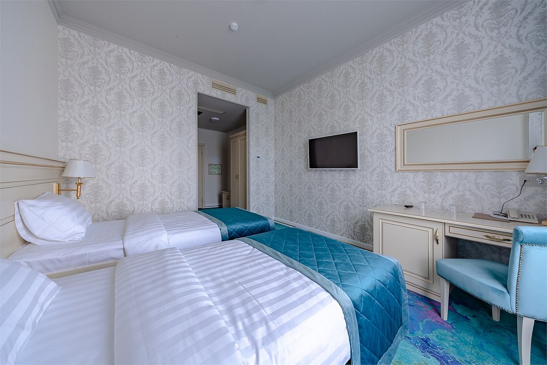 Wi-Fi, система климат-контроля, настольные лампы, фен, электронные замки, душевая кабина, санузел, халаты, банные полотенца, тапочки, косметические средства, две полутораспальные кровати, тумбы, шкаф для одежды, вешалки, письменный стол, зеркало, звуконепроницаемые стены и окна, мини-бар, письменные принадлежности, информационная карта, меню, сейф, питьевая вода, ковровое покрытие, отдельный вход в номер, вид на город, вид во двор, высокие потолки, стаканы, стул, туалетные средства, цифровое тв, внутренний телефон, телевизор с плоским экраном, мини-холодильник, номер для некурящихВ номере