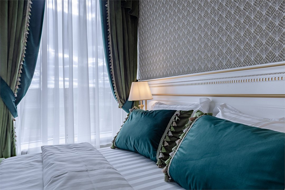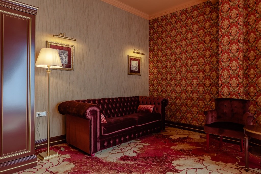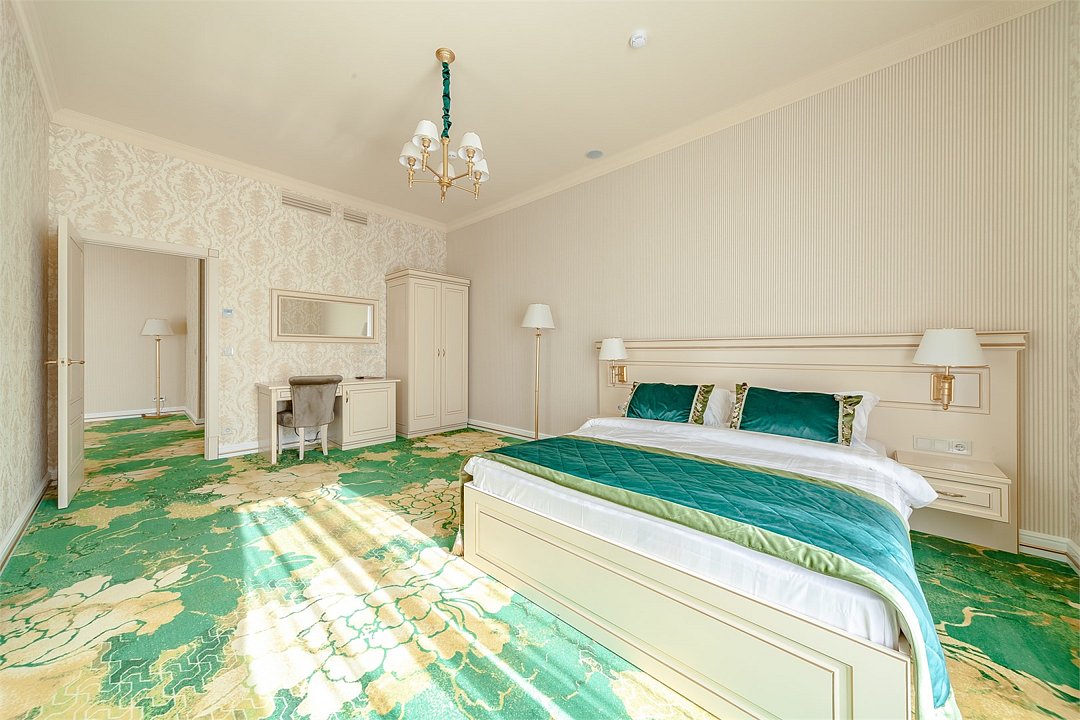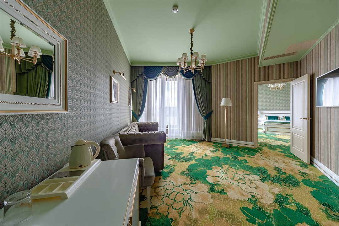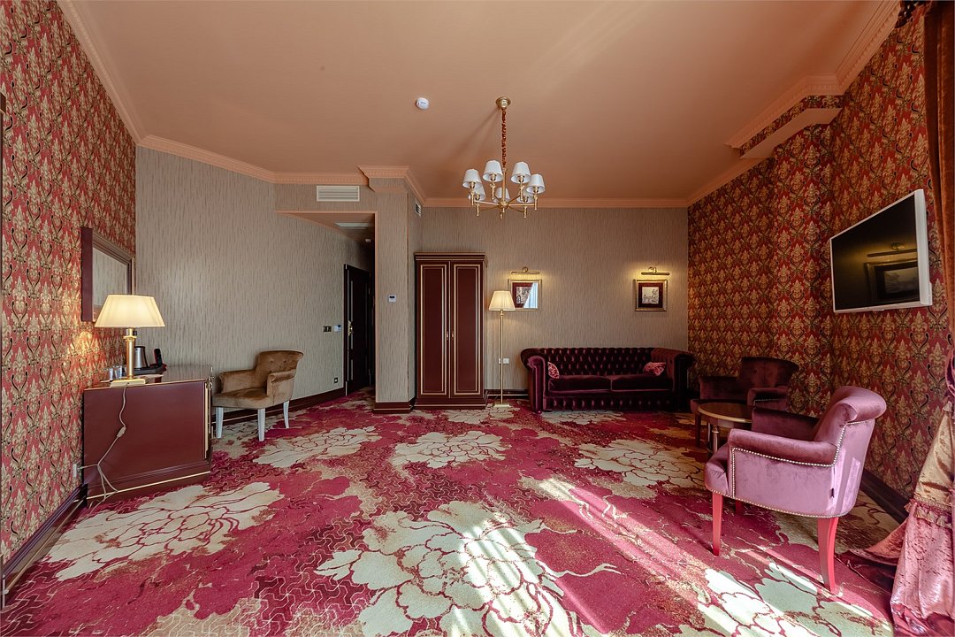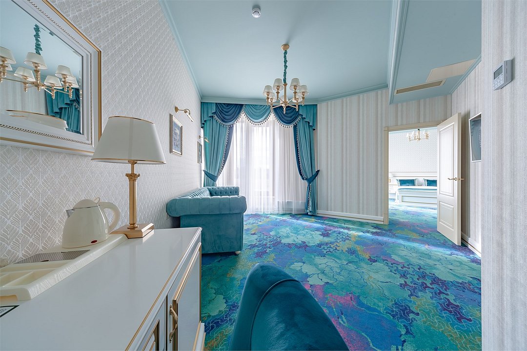 Двухкомнатный номер (спальня и гостиная) Размер номера составляет 47 м². Интерьер номера имеет роскошную обстановку и отделку. Включены дополнительные удобства (тапочки, халаты, чайные и кофейные принадлежности и др.)