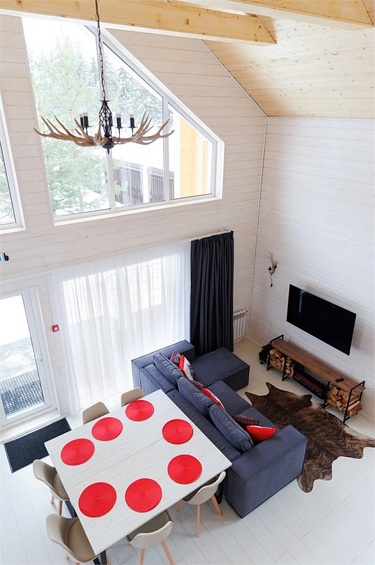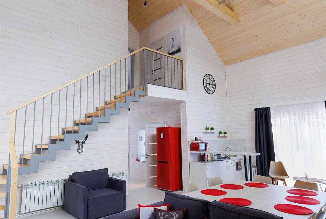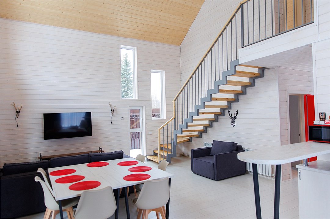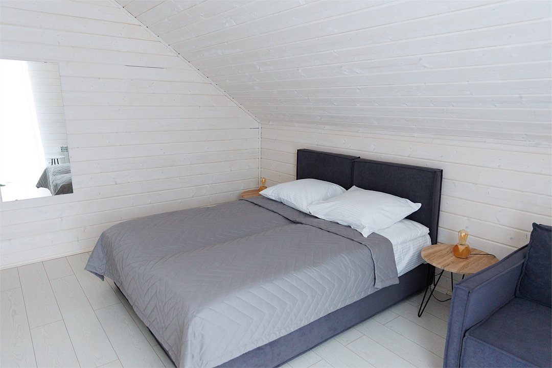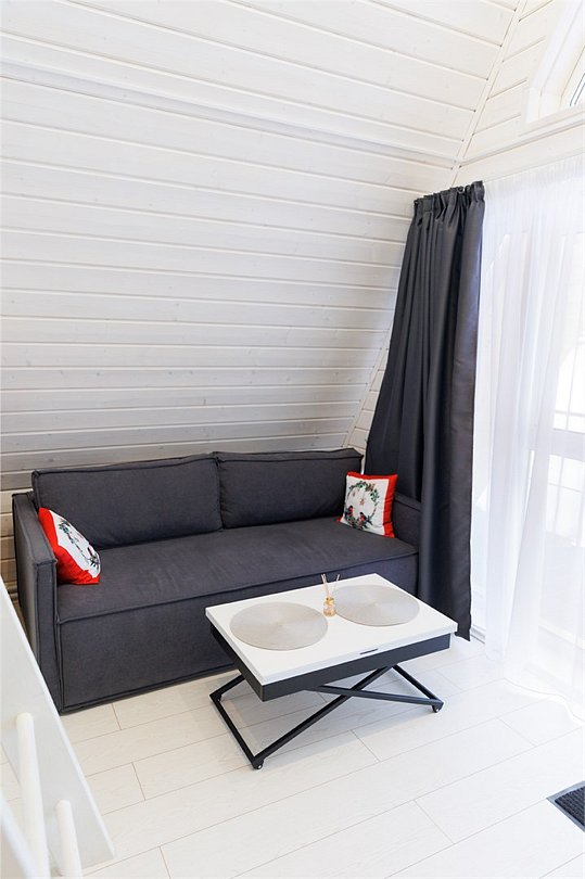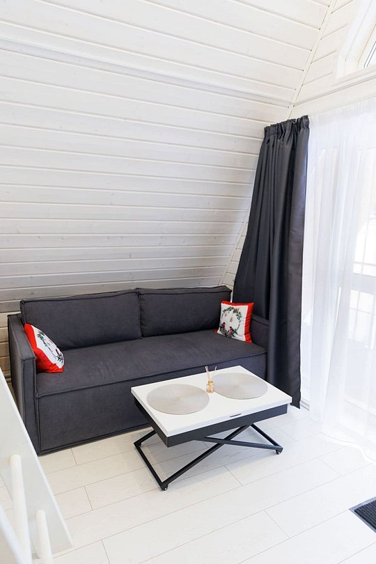 В гостиной, совмещенной с кухней, расположен удобный раскладной диван, который при необходимости позволяет разместить еще двух гостей. Спальные зоны расположены на мансарде и в отдельной комнате на первом этаже.