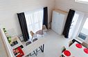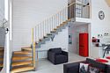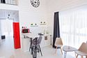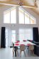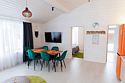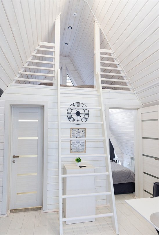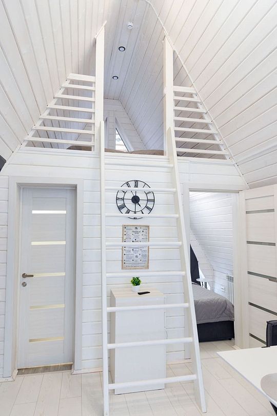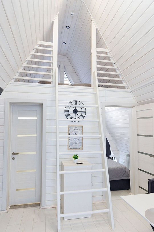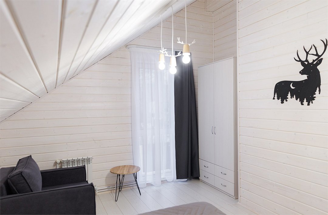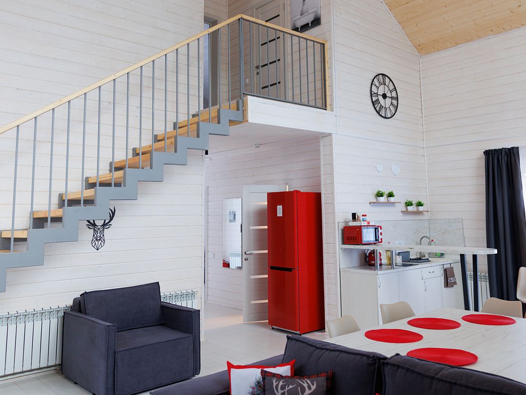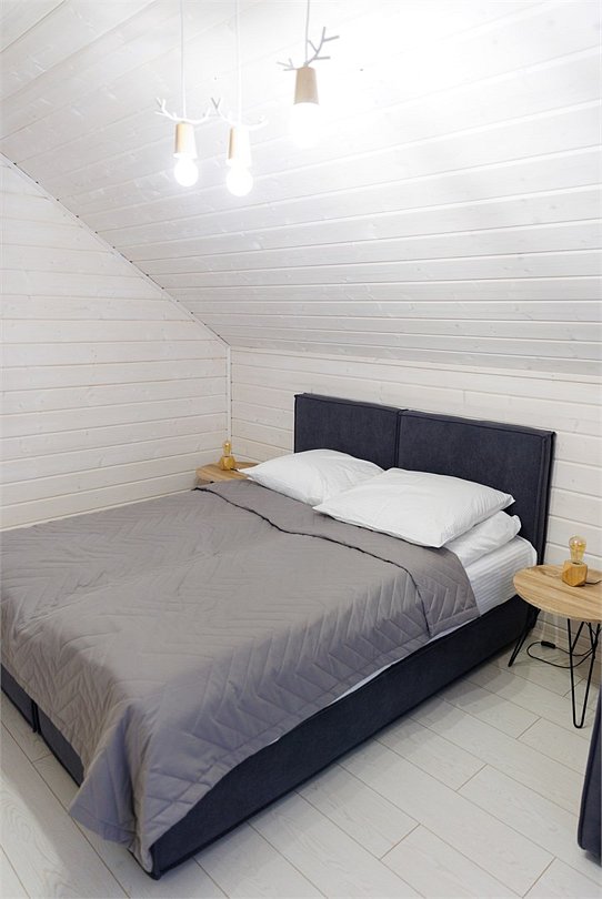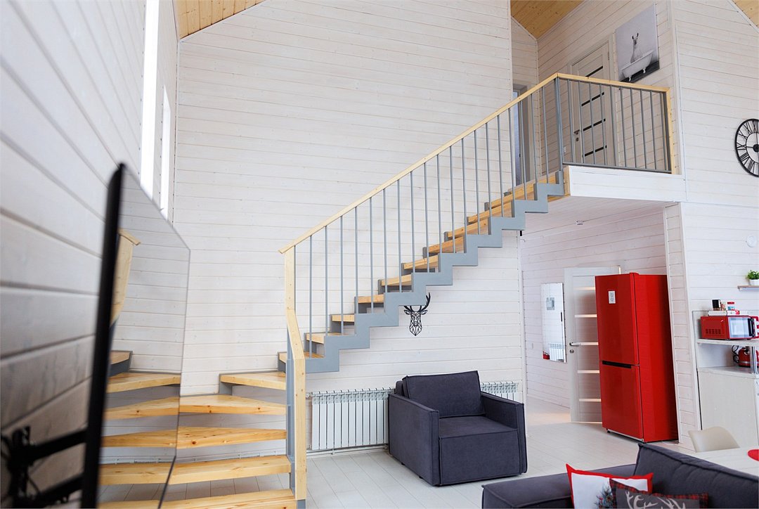 В гостиной, совмещенной с кухней, расположен удобный раскладной диван, который при необходимости позволяет разместить еще двух гостей. Спальные зоны расположены на мансарде и в отдельной комнате на первом этаже.
