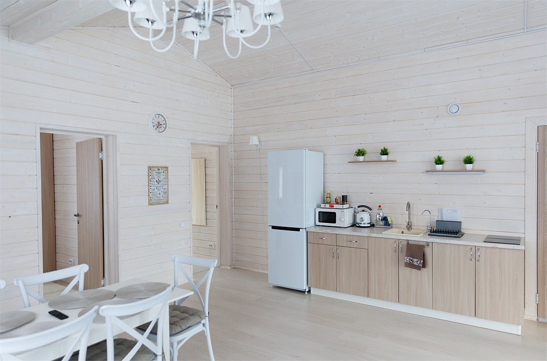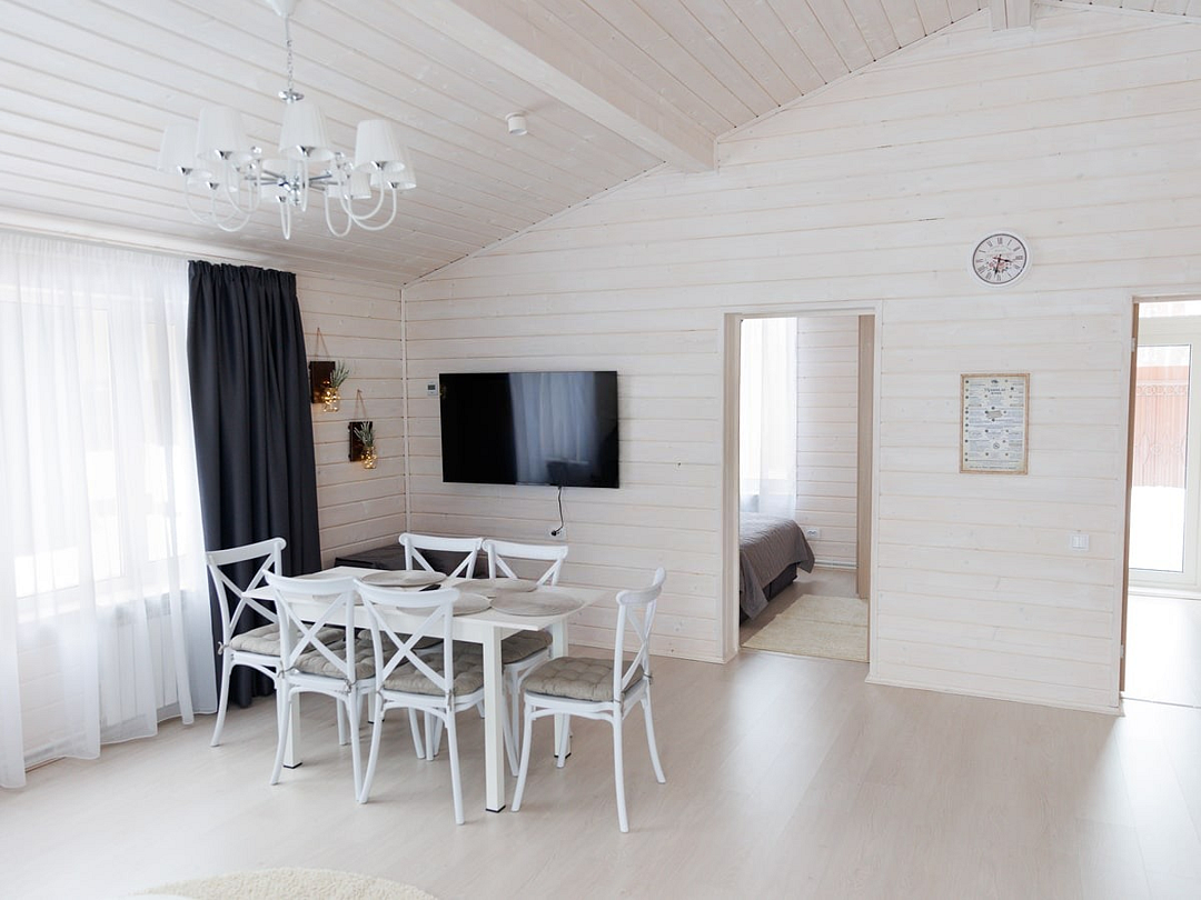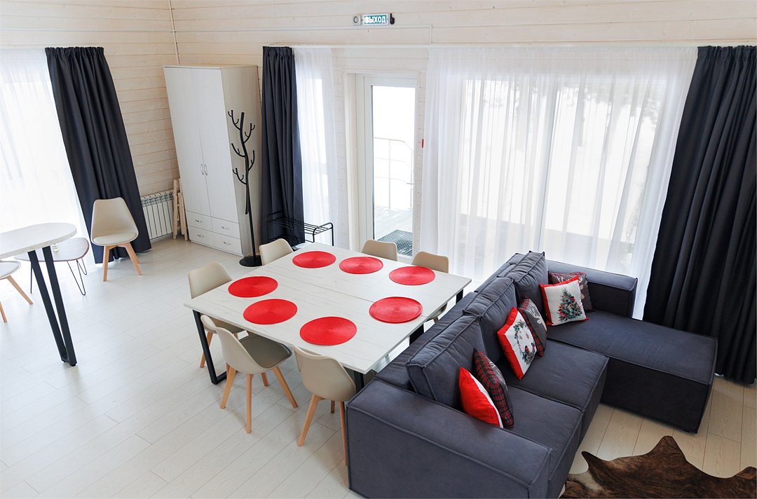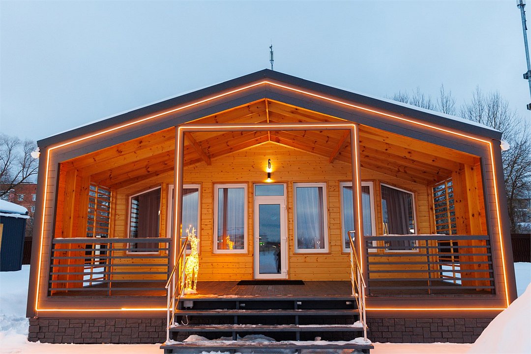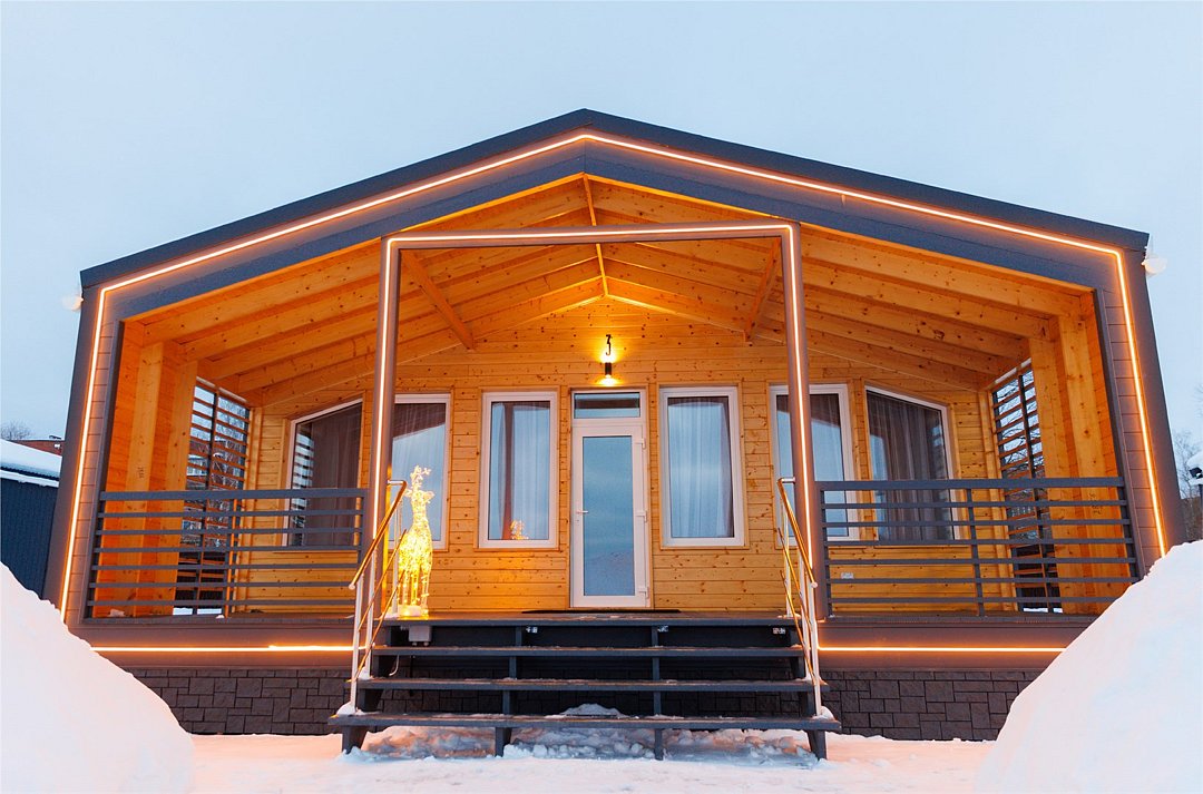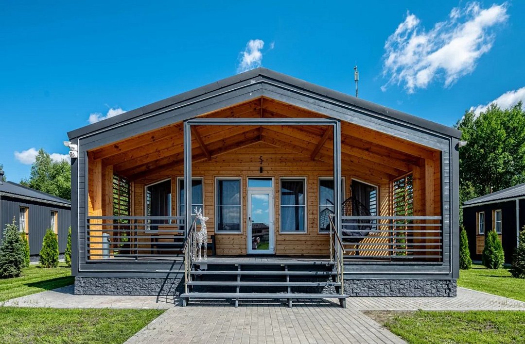 Площадь домика восемьдесят восемь квадратных метров, максимально комфортно позволяет разместить шесть человек. Максимально возможное заселение семь–восемь человек, в зависимости от выбранного дома.