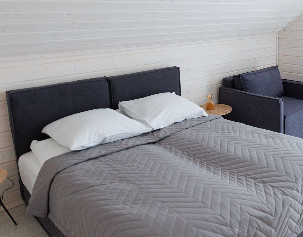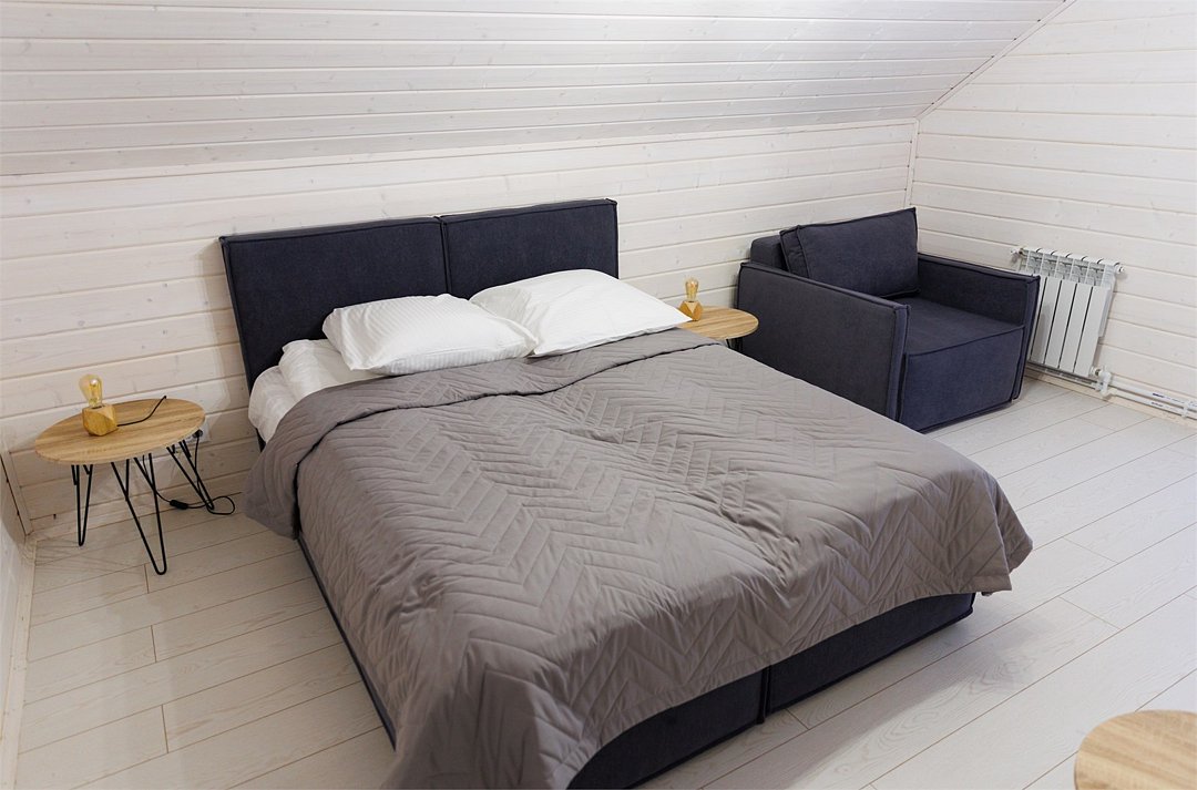 В гостиной, совмещенной с кухней, расположен огромный двуспальный раскладной диван и кресло-трансформер (для доп. спального места). В спальнях двуспальные кровати (при необходимости разделяется на две односпальных) и кресла-трансформеры (для доп. спального места).