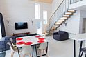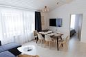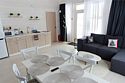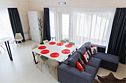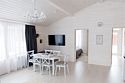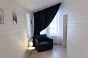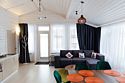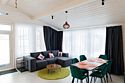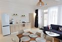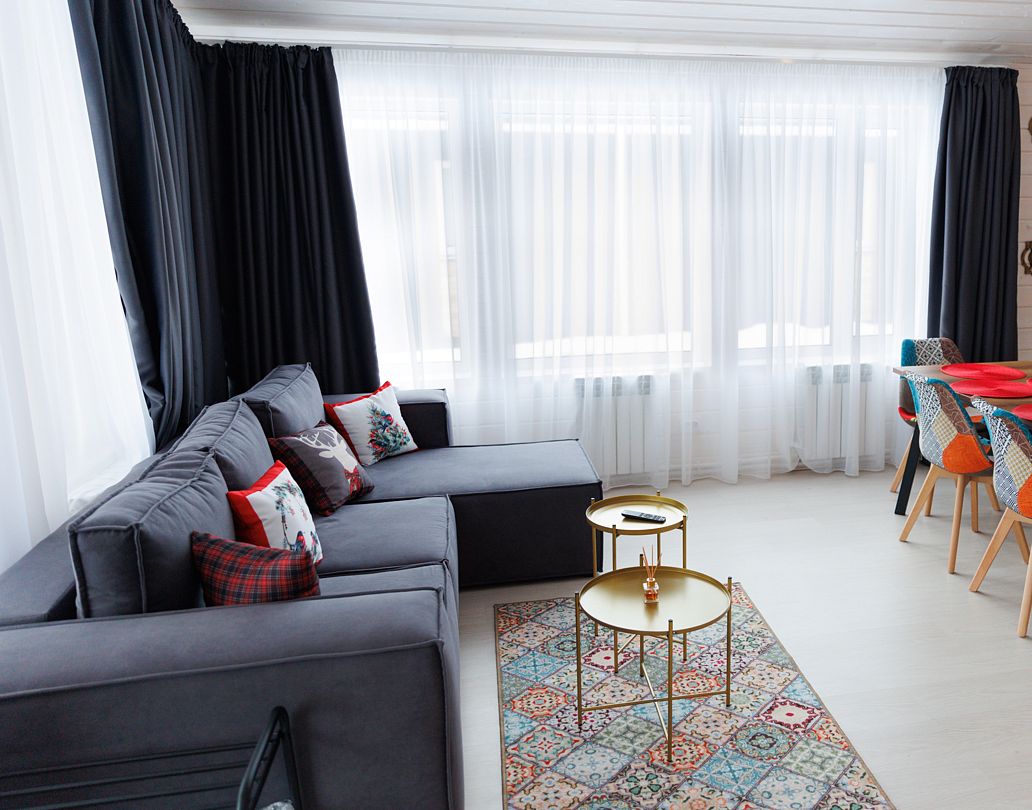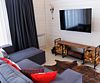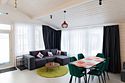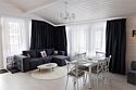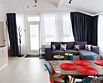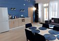 Гостиная, совмещенная с кухней, оборудована огромным двуспальным раскладным диваном. В одной спальне находится двуспальная кровать (при необходимости разделяемая на две односпальные), а в другой — удобный диван и кресло-трансформер, что позволяет создать дополнительное спальное место.