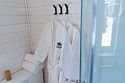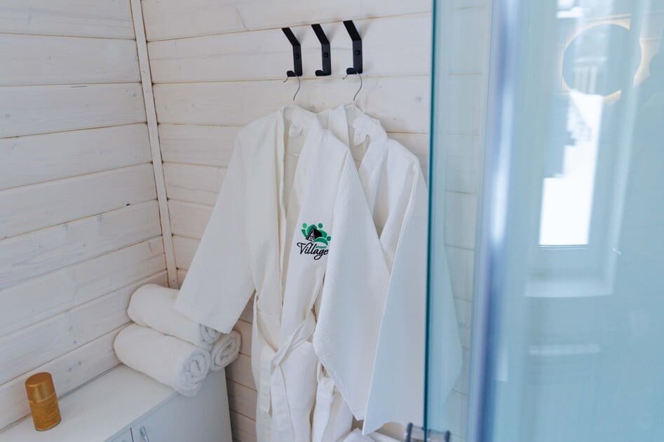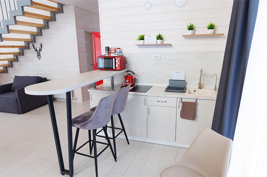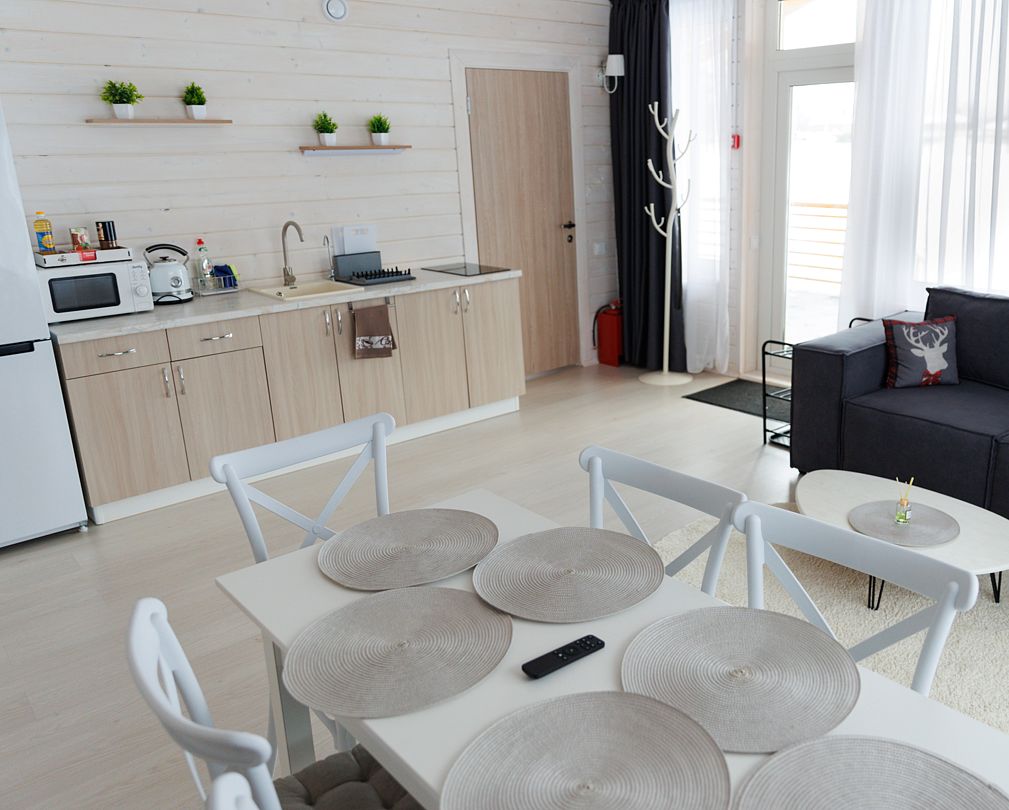 Домик оснащен двумя санузлами — один с душевой кабиной, другой с ванной, а также полноценной кухней с плитой, чайником, микроволновкой и холодильником, а также всей необходимой посудой и барной стойкой. Для Вашего комфорта, в каждом доме предусмотрено централизованное отопление и кондиционер.