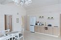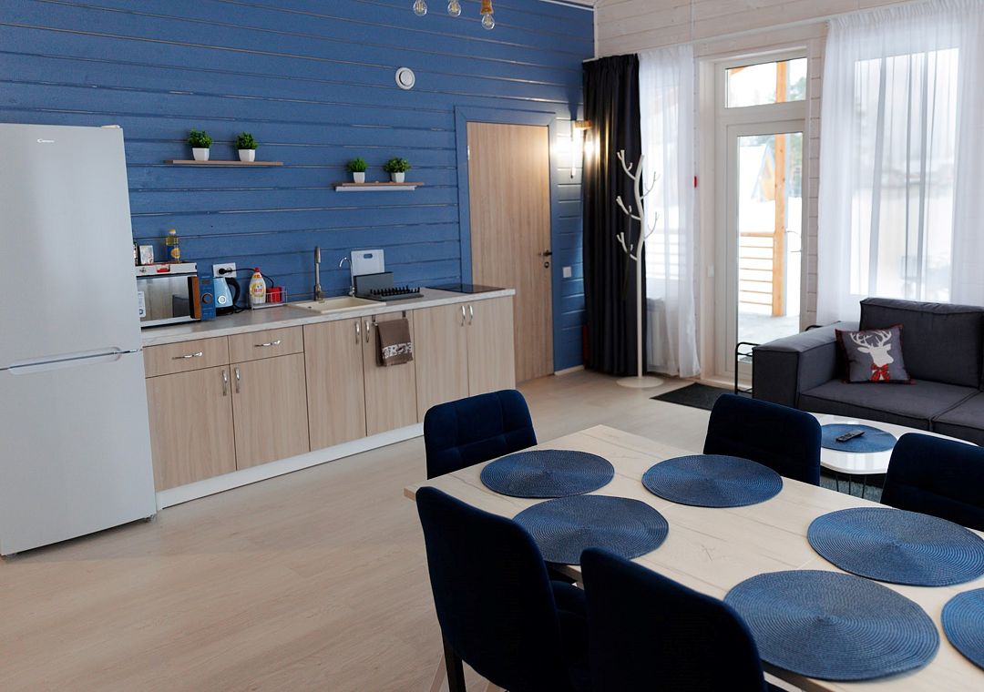 Домик оснащен двумя санузлами — один с душевой кабиной, другой с ванной, а также полноценной кухней с плитой, чайником, микроволновкой и холодильником, а также всей необходимой посудой и барной стойкой. Для Вашего комфорта в каждом доме предусмотрено централизованное отопление и кондиционер.