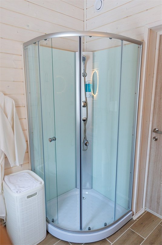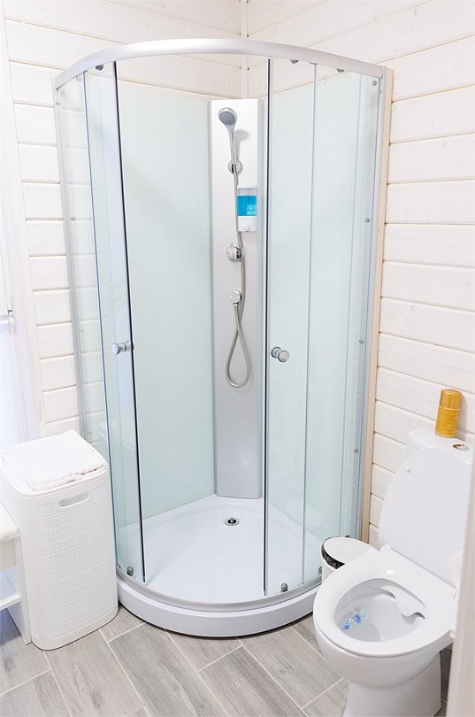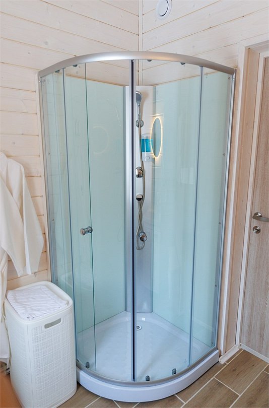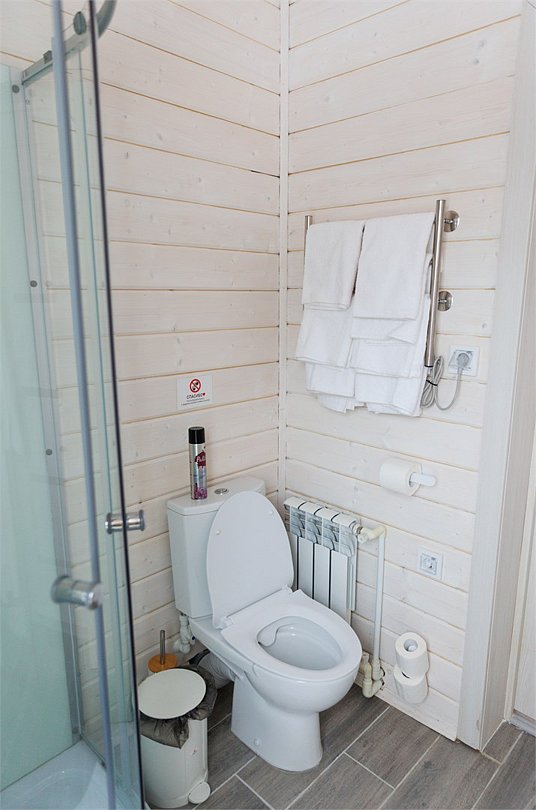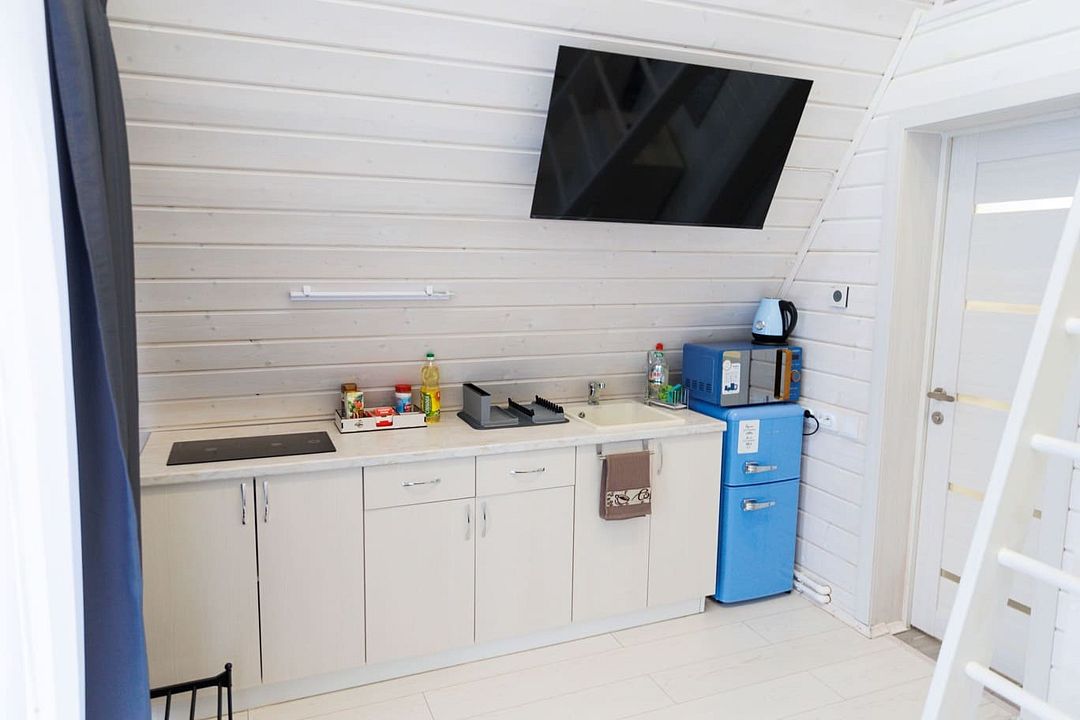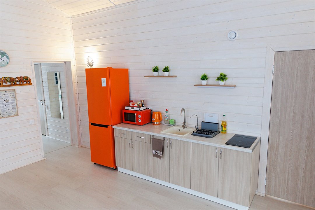 Домик оснащен санузлом с душевой кабиной, полноценной кухней с плитой, чайником, микроволновкой и холодильником, а также всей необходимой посудой. Для вашего комфорта в каждом доме предусмотрено централизованное отопление и кондиционер.