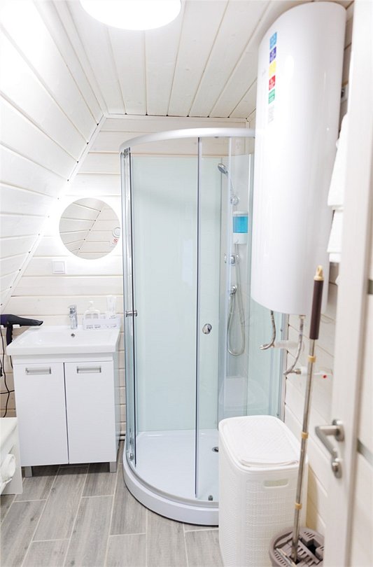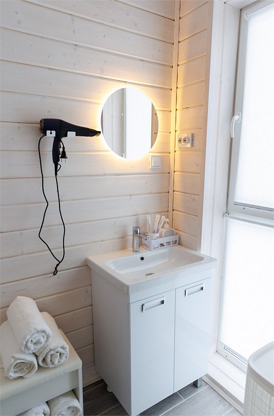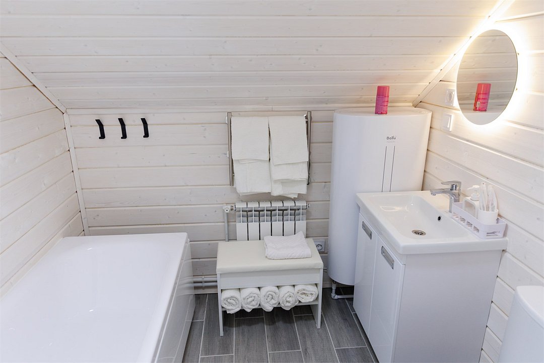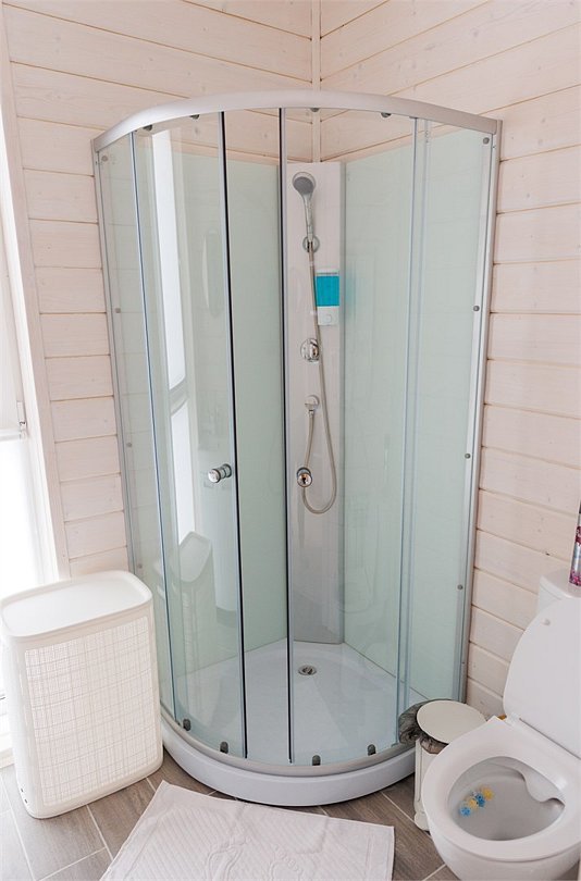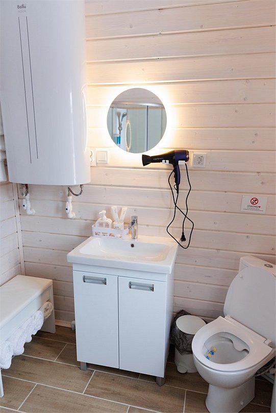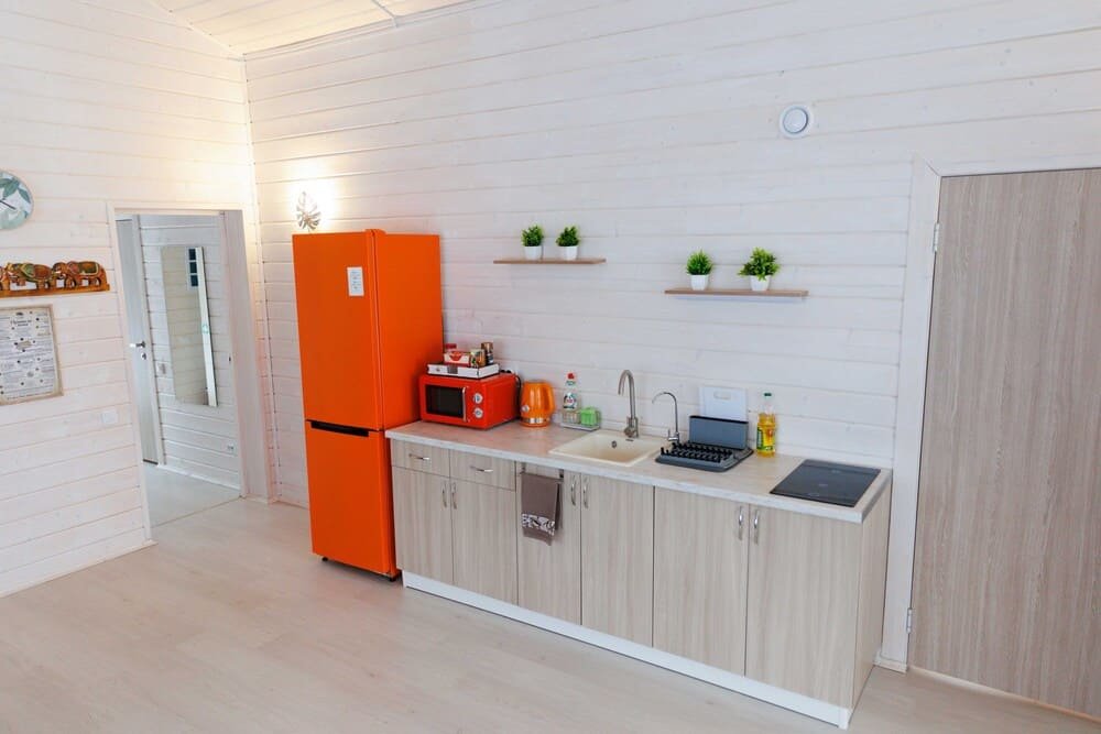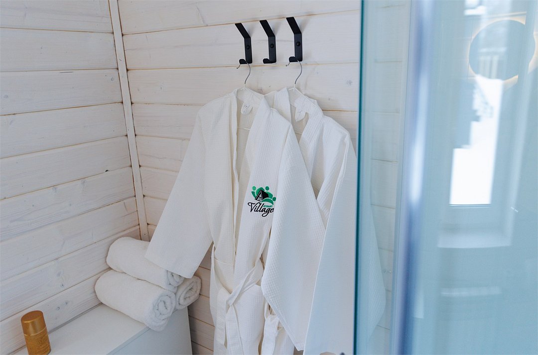 Домик оснащен санузлом с душевой кабиной, полноценной кухней с плитой, чайником, микроволновкой и холодильником, а также всей необходимой посудой. Для вашего комфорта в каждом доме предусмотрено централизованное отопление и кондиционер.