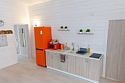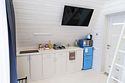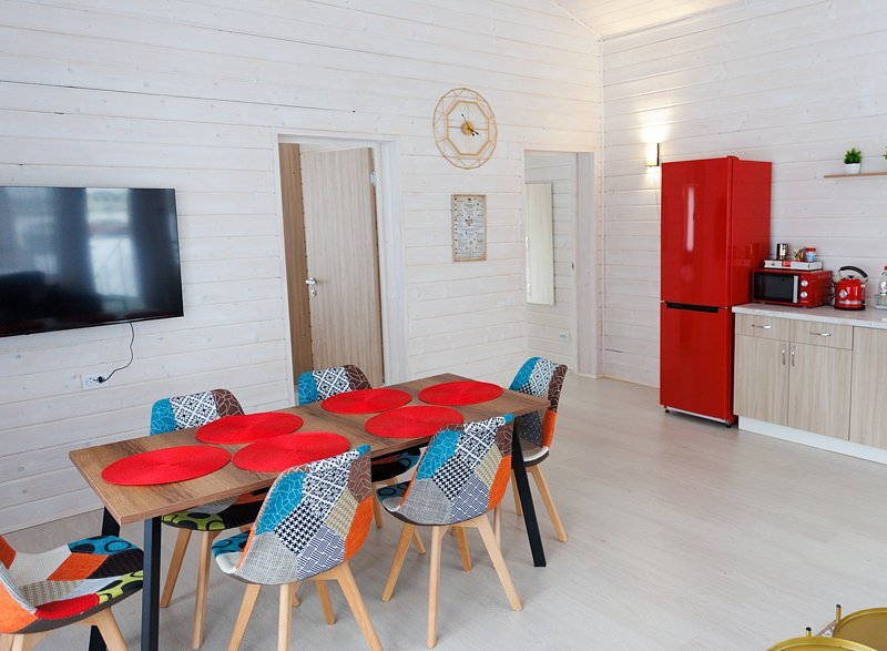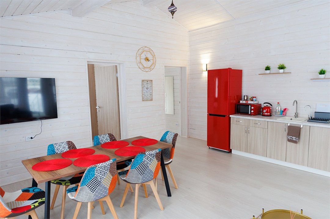 Домик оснащен санузлом с душевой кабиной, полноценной кухней с плитой, чайником, микроволновкой и холодильником, а так же всей необходимой посудой. Для Вашего комфорта, в каждом доме предусмотрено централизованное отопление и кондиционер.
