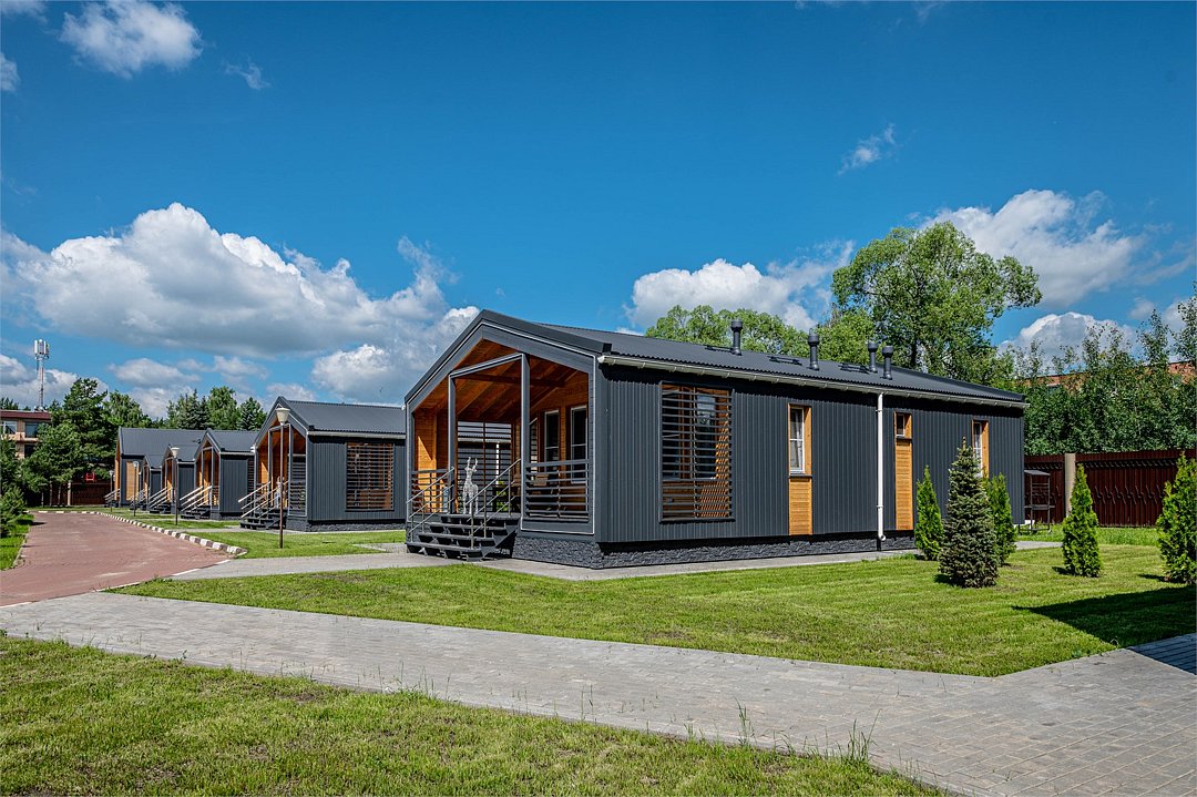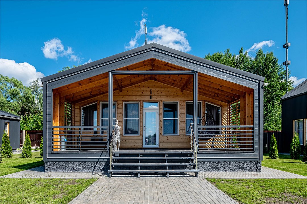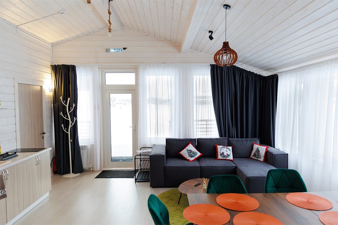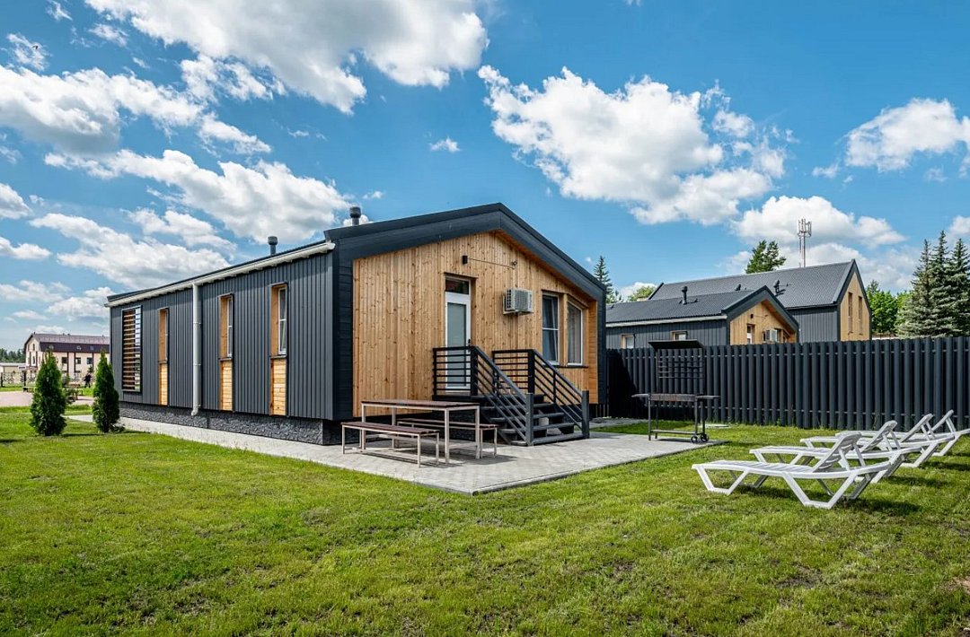 «Модуль-Дом» оформлен в стиле минимализма с использованием натуральных материалов, создавая атмосферу умиротворения и спокойствия.