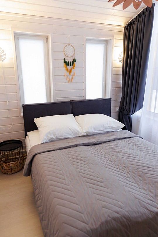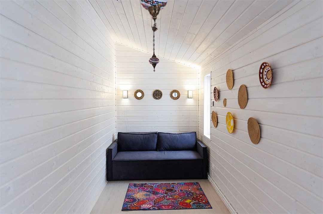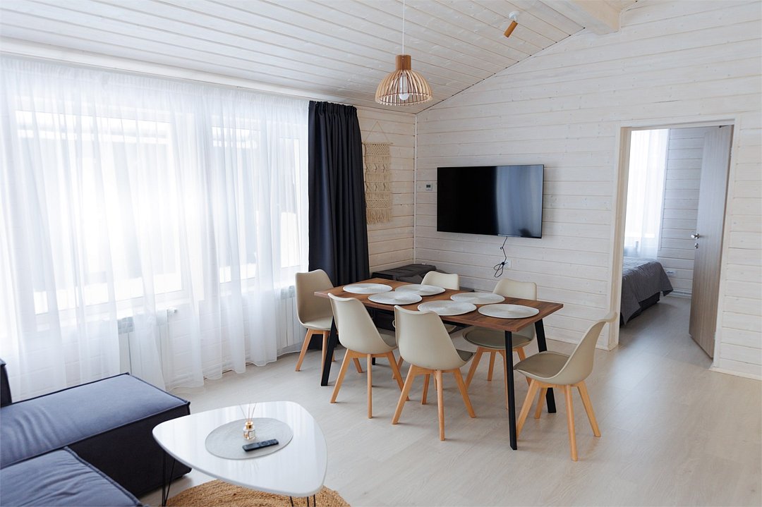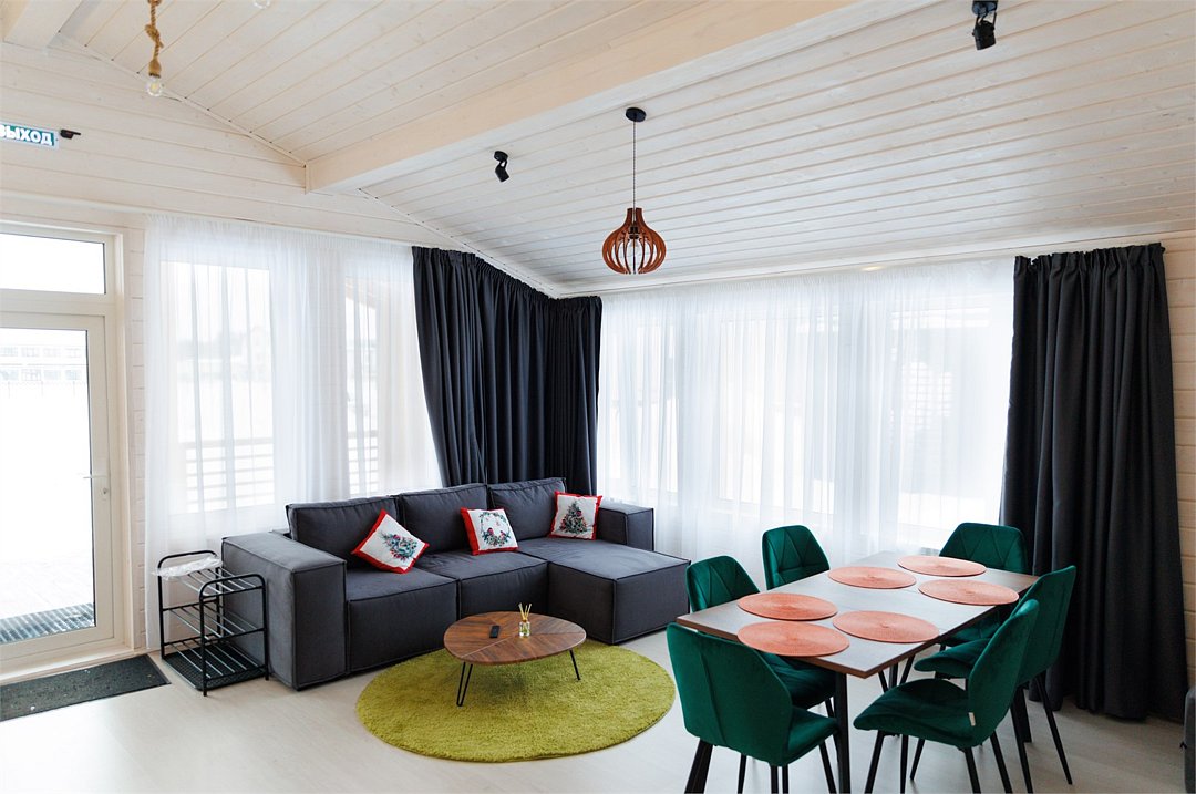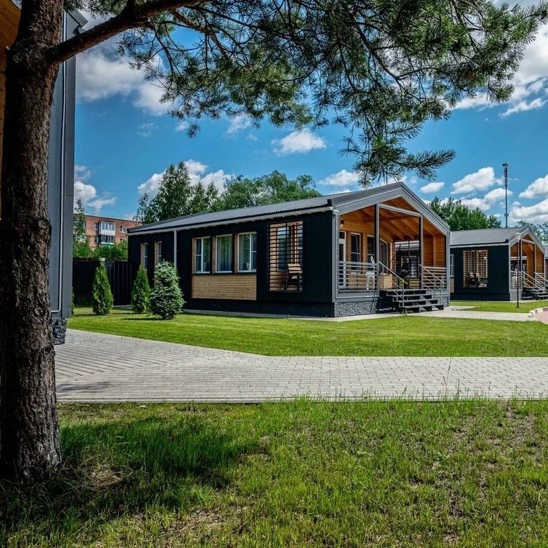 «Модуль-Дом» оформлен в стиле минимализма с использованием натуральных материалов, создавая атмосферу умиротворения и спокойствия.