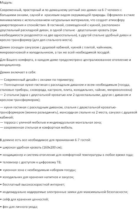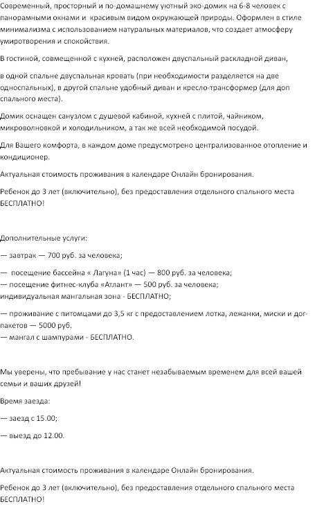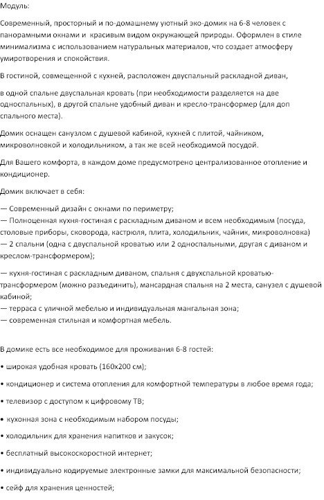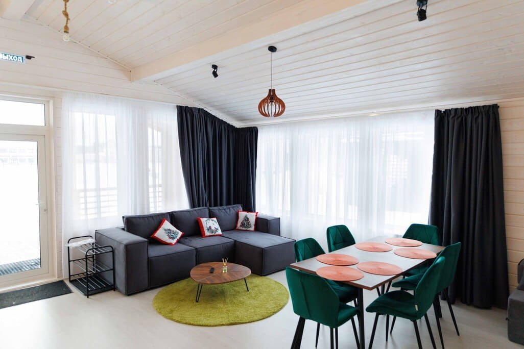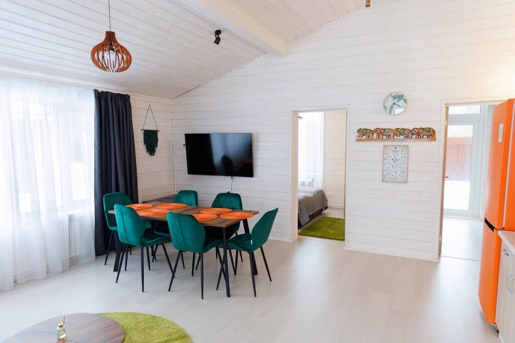 Современный и тёплый эко-дом для 6–8 гостей, где все продумано для большой семьи или компании на 6-8 человек. Панорамные окна, натуральные материалы и атмосфера домашнего уюта. 6 человек (основной тариф) + 2 человека (за дополнительную плату). В доме: 2 спальни, кухня-гостиная, душ, кондиционер, отопление. Мангал и шампуры — бесплатно Можно с питомцем до 3,5 кг за дополнительную плату (лежанка, миска, лоток). Дети до 3 лет — бесплатно без предоставления места. Дополнительно: завтрак — 700 ₽, бассейн — 800 ₽/час, фитнес — 500 ₽. Цены и свободные даты — в календаре бронирования. Заезд с 15:00, выезд до 12:00 Мы уверены, что пребывание у нас станет незабываемым временем для всей вашей семьи и ваших друзей!Услуги и удобства