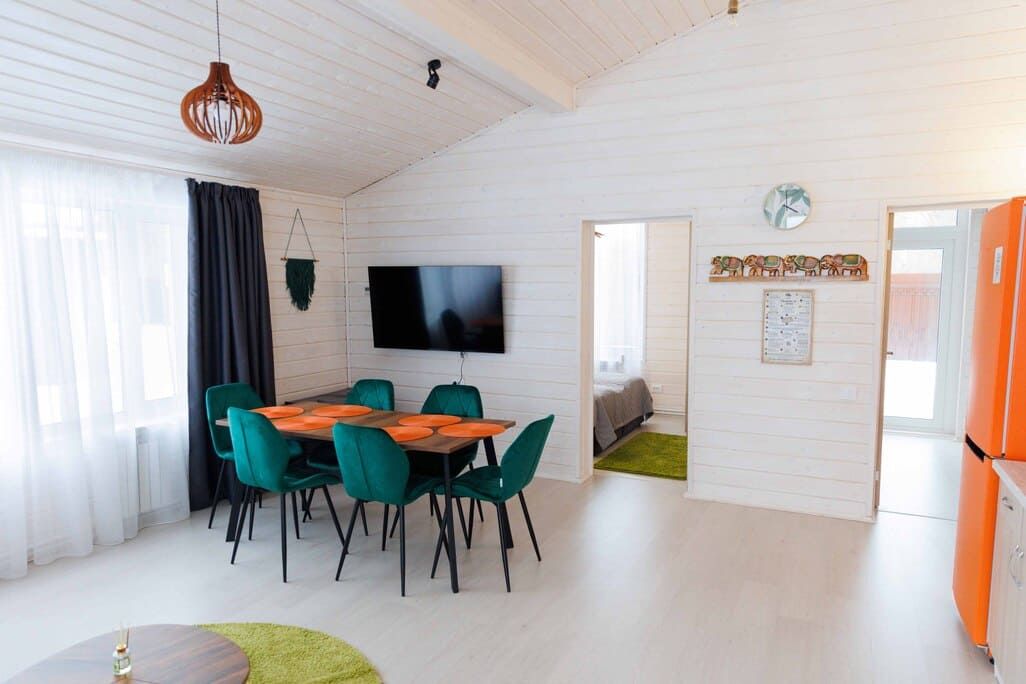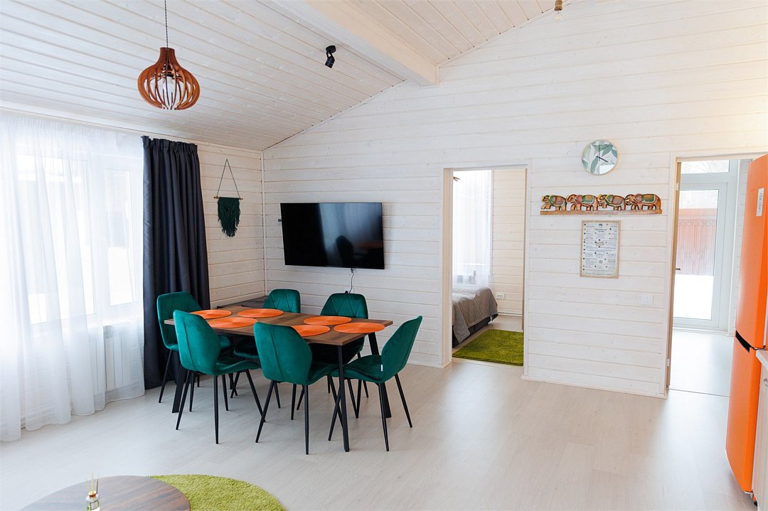 Домик оснащен современными удобствами: централизованное отопление, кондиционер, проекционный экран и ЖК телевизор. Доступна кухня с холодильником, микроволновкой и раковиной, а также крытая мангальная зона во дворе, где вам предоставят шампуры и решетки.