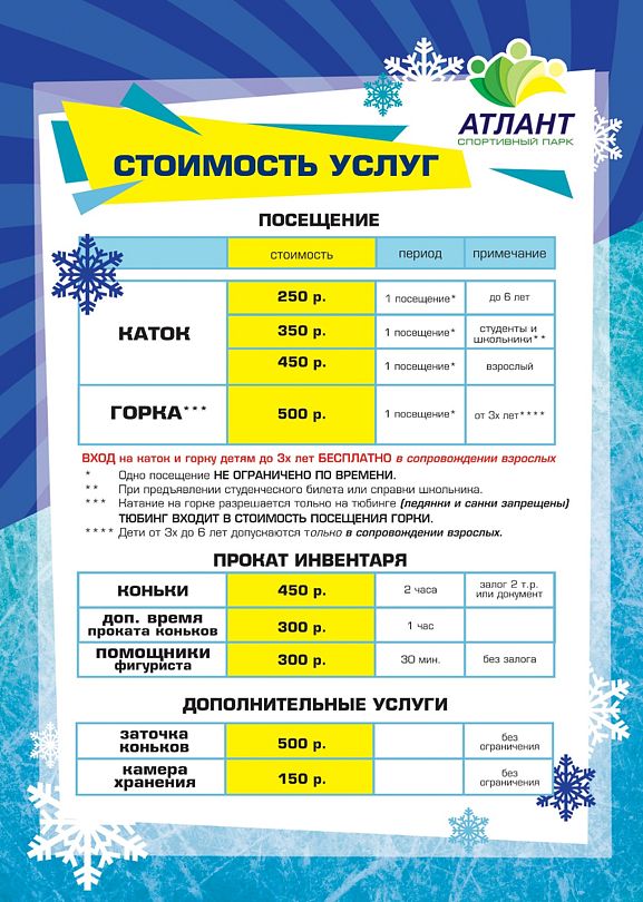 В «Атлант Вилладж» предусмотрены теплые раздевалки, ячейки для хранения вещей и чистые туалеты. Каток работает без перерывов с понедельника по воскресенье, но время работы может меняться в зависимости от погодных условий.