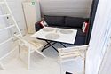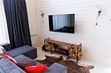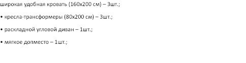 В гостиной, совмещенной с кухней, расположен огромный двуспальный раскладной диван и кресло-трансформер (для доп. спального места), в спальнях — двуспальные кровати (при необходимости разделяется на две односпальных) и кресла-трансформеры (для доп. спального места).