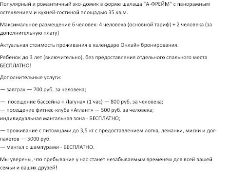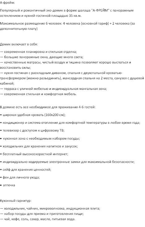 Романтичный эко-домик с панорамными окнами, верандой и мангальной зоной. 35 м² уюта, где всё продумано для отдыха пары, семьи или компании до 6 человек. 4 человека (основной тариф) + 2 человека (за дополнительную плату). В доме: кухня-гостиная, спальня, посуда, кондиционер, отопление. Мангал и шампуры — бесплатно Можно с питомцем до 3,5 кг за дополнительную плату (лежанка, миска, лоток). Дети до 3 лет — бесплатно без предоставления места. Дополнительно: завтрак — 700 ₽, бассейн — 800 ₽/час, фитнес — 500 ₽. Цены и свободные даты — в календаре бронирования. Заезд с 15:00, выезд до 12:00 Мы уверены, что пребывание у нас станет незабываемым временем для всей вашей семьи и ваших друзей!Услуги и удобства