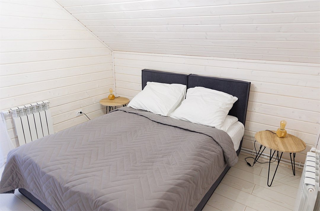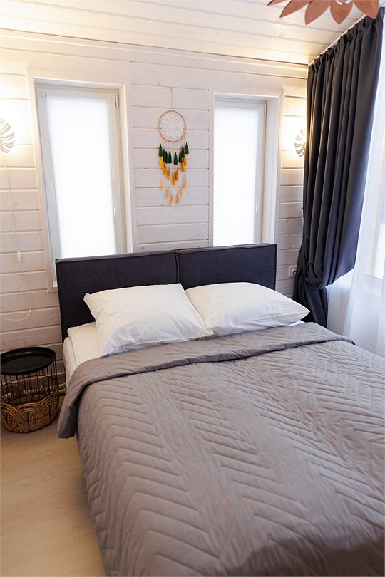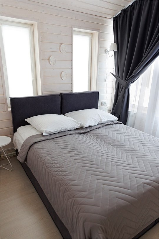 В спальнях две односпальные кровати или одна двуспальная. Для Вашего удобства, Вы можете дополнительно заказать завтрак в номер, тапочки, халаты, зубной набор, бритвенные принадлежности, чай, кофе, сахар, а также решетки и шампура.