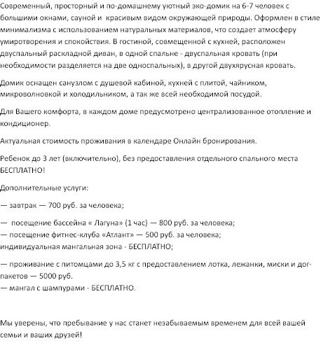 Тёплый дом с душой и собственной сауной для комфортного отдыха большой семьи или компании из 6–7 человек. 6 человек (основной тариф) + 1 человек (за дополнительную плату). В доме: 2 спальни, кухня-гостиная, душ, кондиционер, отопление. Мангал и шампуры — бесплатно Сауна — для вашего личного релакса Можно с питомцем до 3,5 кг за дополнительную плату (лежанка, миска, лоток). Дети до 3 лет — бесплатно без предоставления места. Дополнительно: завтрак — 700 ₽, бассейн — 800 ₽/час, фитнес — 500 ₽. Цены и свободные даты — в календаре бронирования. Заезд с 15:00, выезд до 12:00 Мы уверены, что пребывание у нас станет незабываемым временем для всей вашей семьи и ваших друзей!Услуги и удобства