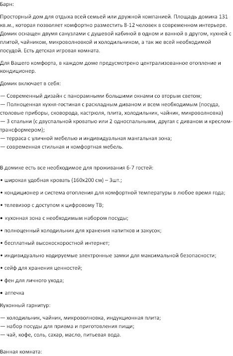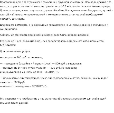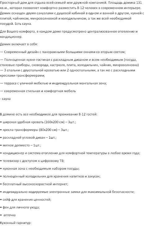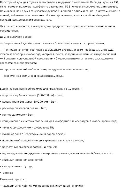 Площадь домика сто тридцать один квадратный метр, максимально комфортно позволяет разместить восемь человек. Максимально возможное заселение до двенадцати человек.