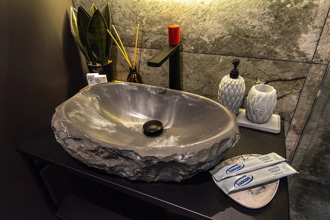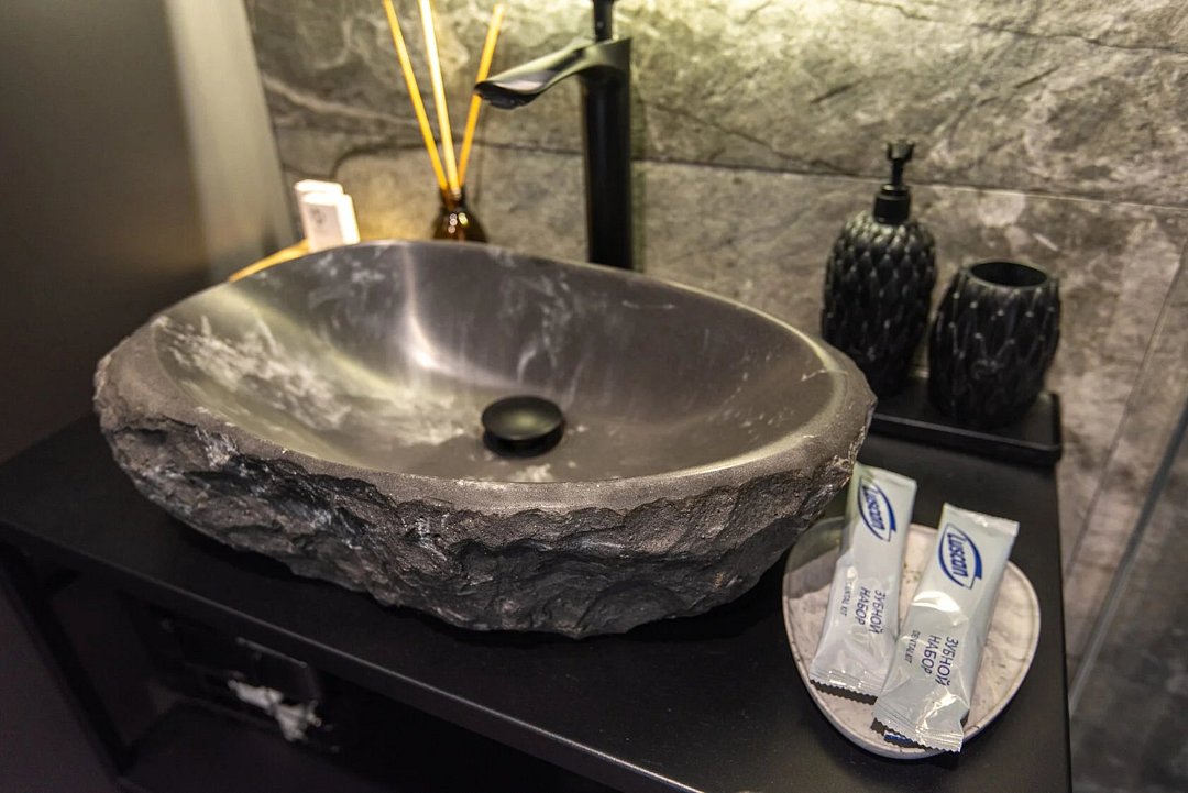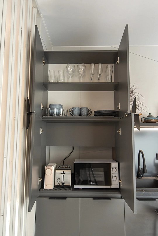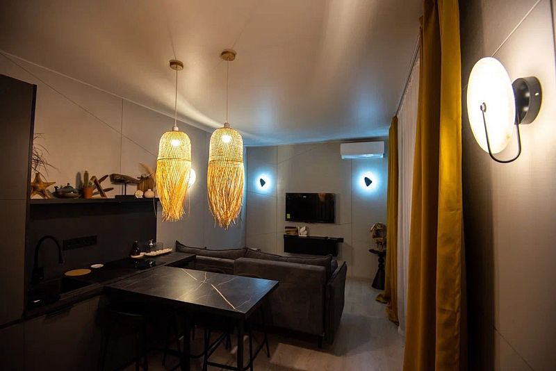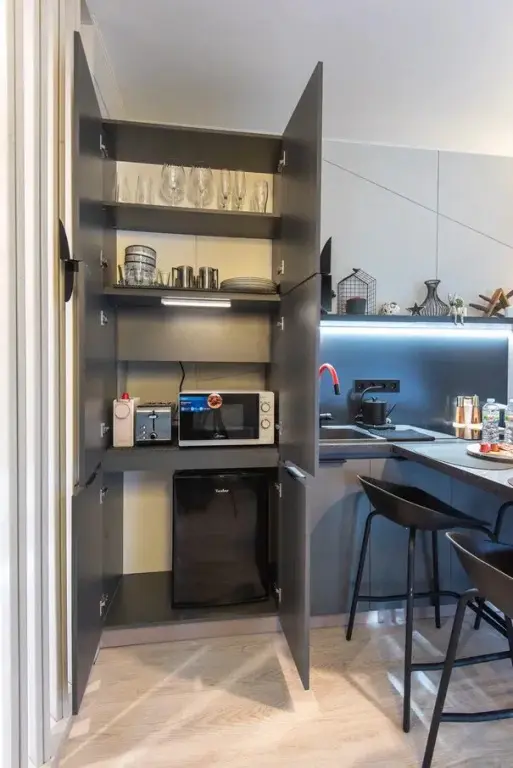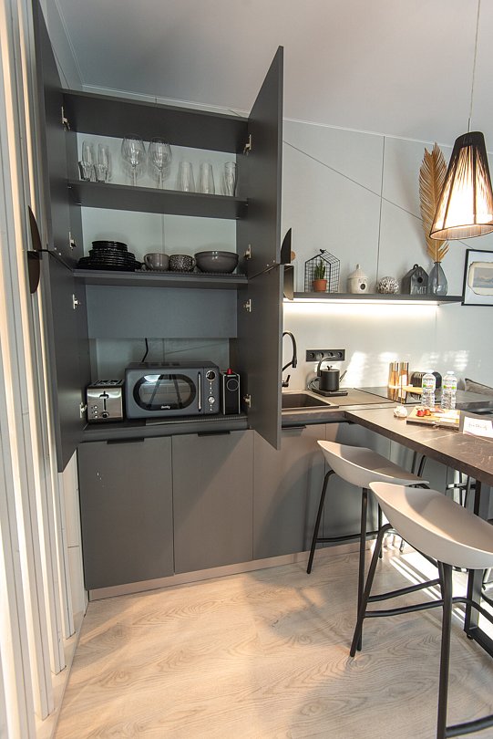 Авторский дизайн интерьеров. Оборудованная всей необходимой техникой мини-кухня (плита, СВЧ печь, чайник, холодильник, тостер, капсульная кофемашина), полный комплект посуды, постельное белье, полотенца, халаты, тапочки, панорамные окна.