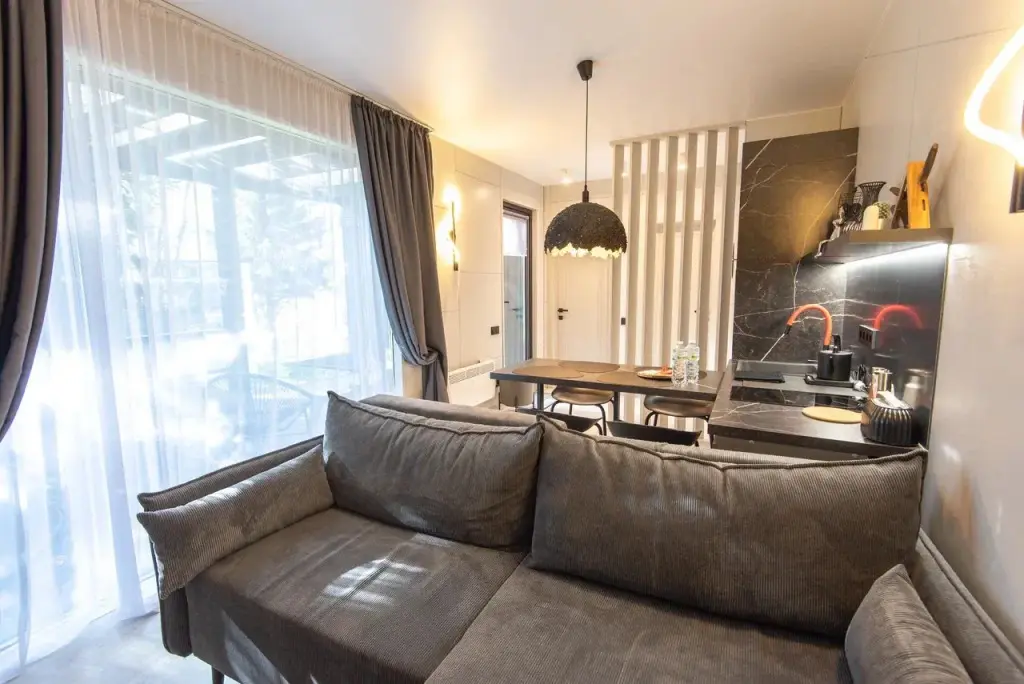 В гостиной раскладной диван, ТВ с Алисой, кондиционер, вместительные шкафы для одежды, крытая терраса, на террасе стол и стулья для комфортного отдыха, купель на каждой террасе, у каждого дома своя мангальная зона.