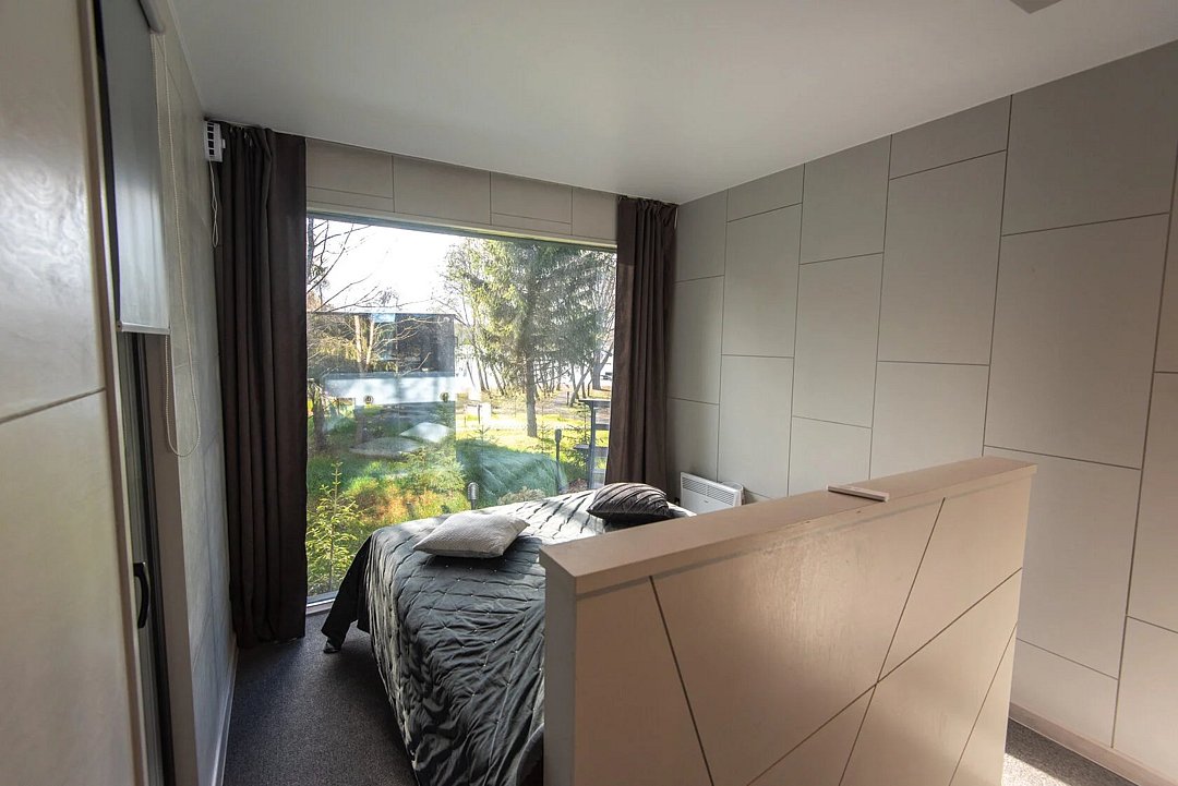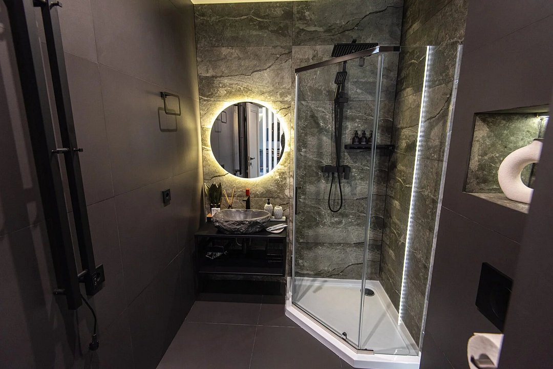 Просторный санузел с душевой кабиной. Изолированная спальня с комфортной двуспальной кроватью.